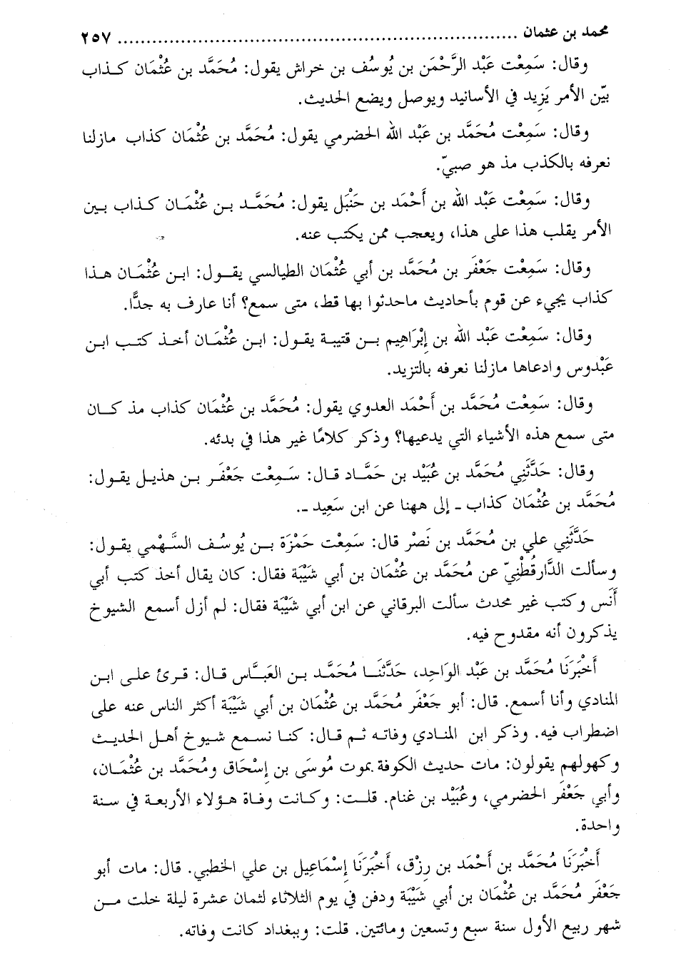 وقَالَ: سَمِعْتُ عَبْد الرَّحْمَن بْن يُوسُف بْن خراش يقول: محمد بن عثمان كذاب بين الأمر يزيد في الأسانيد ويوصل ويضع الحديث.