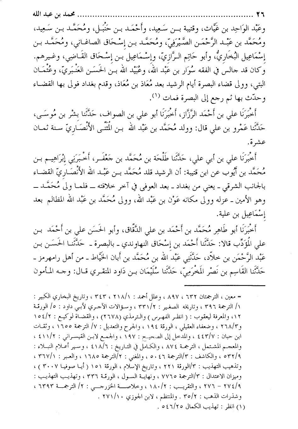 أَخْبَرَنَا أبو طاهر محمد بن أحمد بن علي الدقاق، وأَبُو الْحَسَنِ عَلِيُّ بْنُ أَحْمَدَ بْنِ عَلِيٍّ المؤدب قالا: حَدَّثَنَا أحمد بن إسحاق النهاوندي- بالبصرة- حَدَّثَنَا الْحَسَن بن عبد الرحمن بن خلاد، حَدَّثَنِي عبد الله بن محمد بن أبان الخيّاط- من أهل رامهرمز- حدّثنا القاسم بن نصر المخرميّ، حَدَّثَنَا سليمان بن داود المنقري قَالَ: وجه المأمون