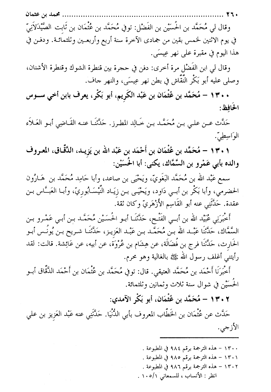 1301- محمد بن عُثْمَان بْن أَحْمَد بْن عَبْد اللَّه بْن يزيد، الدقاق، المعروف والده بأبي عمرو بن السماك، يكنى: أبا الحسين [2] :
