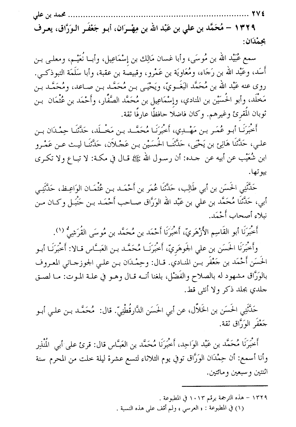 1329- مُحَمَّد بْن عليّ بْن عَبْد اللَّه بْن مهران، أبو جعفر الوراق، يعرف بحمدان [1] :