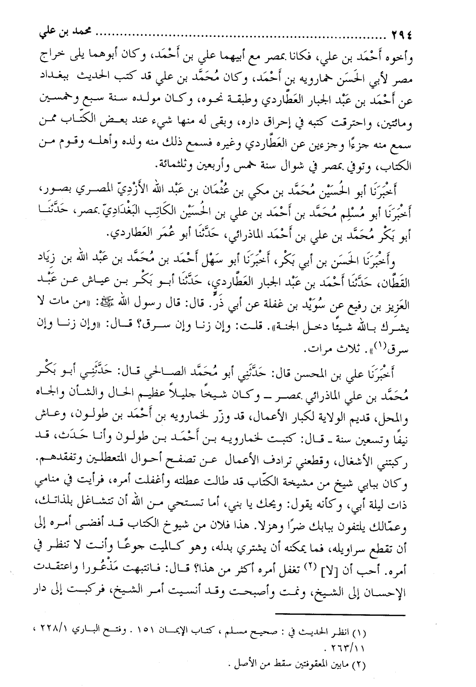 أَخْبَرَنَا أَبُو الْحُسَيْنِ مُحَمَّدُ بْنُ مَكِّيِّ بْنِ عُثْمَانَ بْنِ عَبْدِ اللَّهِ الأَزْدِيُّ الْمِصْرِيُّ بِصُورَ، أَخْبَرَنَا أَبُو مُسْلِمٍ مُحَمَّدُ بْنُ أَحْمَدَ بْنِ عليّ بن الحسين الكاتب البغداديّ بمصر، حدثنا أَبُو بَكْر مُحَمَّد بْن علي بْن أَحْمَد الماذرائي، حَدَّثَنَا أَبُو عُمَرَ الْعُطَارِدِيُّ.