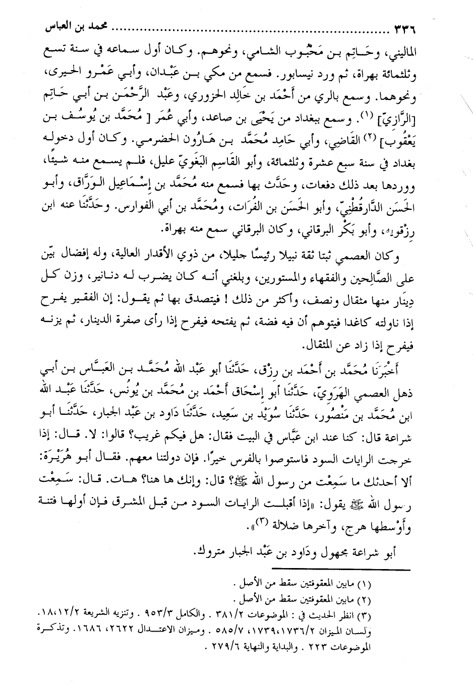 أَخْبَرَنَا مُحَمَّدُ بْنُ أَحْمَدَ بْنِ رزق، حَدَّثَنَا أَبُو عَبْدِ اللَّهِ مُحَمَّدُ بْنُ الْعَبَّاسِ بْنِ أبي ذهل العصمي الهرويّ، حَدَّثَنَا أَبُو إِسْحَاقَ أَحْمَدُ بْنُ مُحَمَّدِ بْنِ يونس، حدّثنا عبد الله ابن محمّد بن منصور، حدّثنا سويد بن سعيد، حدّثنا داود بن عبد الجبار، حَدَّثَنَا أَبُو شُرَاعَةَ قَالَ: كُنَّا عِنْدَ ابْنِ عَبَّاسٍ فِي الْبَيْتِ فَقَالَ: هَلْ فِيكُمْ غَرِيبٌ؟ قَالُوا: لا. قَالَ: إِذَا خَرَجَتِ الرَّايَاتُ السُّودُ فَاسْتَوْصُوا بِالْفُرْسِ خَيْرًا. فَإِنَّ دَوْلَتَنَا مَعَهُمْ. فَقَالَ أَبُو هُرَيْرَةَ: