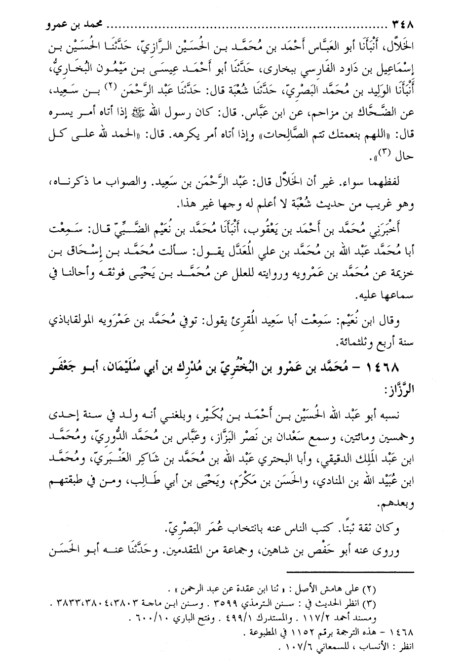 الخلّال، أنبأنا أَبُو الْعَبَّاسِ أَحْمَدُ بْنُ مُحَمَّدِ بْنِ الْحُسَيْنِ الرّازيّ، حَدَّثَنَا الْحُسَيْنُ بْنُ إِسْمَاعِيلَ بْنِ دَاوُدَ الْفَارِسِيُّ ببخارى، حَدَّثَنَا أَبُو أَحْمَدَ عِيسَى بْنُ مَيْمُونٍ الْبُخَارِيُّ، أنبأنا الوليد بن محمّد البصريّ، حدّثنا شعبة قال: حدّثنا عَبْدِ الرَّحْمَنِ [1] بْنِ سَعِيدٍ، عَنِ الضَّحَّاكِ بْنِ مُزَاحِمٍ، عَنِ ابْنِ عَبَّاسٍ. قَالَ: كَانَ رَسُولُ اللَّهِ صَلَّى اللَّهُ عَلَيْهِ وَسَلَّمَ إِذَا أَتَاهُ أَمْرٌ يَسُرُّهُ قَالَ: «اللَّهُمَّ بِنِعْمَتِكَ تَتِمُّ الصَّالِحَاتُ» وَإِذَا أَتَاهُ أَمْرٌ يَكْرَهُهُ. قَالَ: «الْحَمْدُ لِلَّهِ عَلَى كُلِّ حَالٍ [2] »