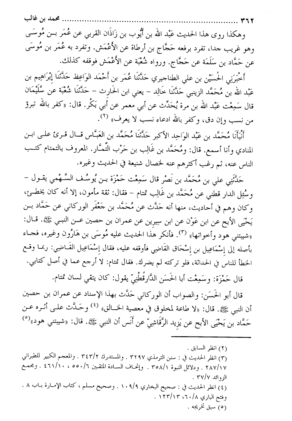 حدَّثَنِي عَلِيّ بْن مُحَمَّد بْن نَصْر قَالَ سمعت حمزة بن يُوسُفَ السَّهْمِيَّ يَقُولُ- وَسُئِلَ الدَّارَقُطْنِيُّ عَنْ مُحَمَّدِ بْنِ غَالِبٍ تَمْتَامٍ- فَقَالَ: ثِقَةٌ مَأْمُونٌ، إِلا أَنَّهُ كَانَ يُخْطِئُ، وَكَانَ وَهِمٌ فِي أَحَادِيثَ، مِنْهَا أَنَّهُ حَدَّثَ عَنْ مُحَمَّدِ بْنِ جَعْفَرٍ الْوَرْكَانِيِّ عَنْ حَمَّادِ بْنِ يَحْيَى الأَبَحِّ عَنِ ابْنِ عَوْنٍ عَنِ ابْنِ سِيرِينَ عَنْ عِمْرَانَ بْنِ حُصَيْنٍ عَنِ النَّبِيِّ صَلَّى اللَّهُ عَلَيْهِ وَسَلَّمَ. قَالَ: «شَيَّبَتْنِي هُودٌ وَأَخَوَاتُهَا» [2]