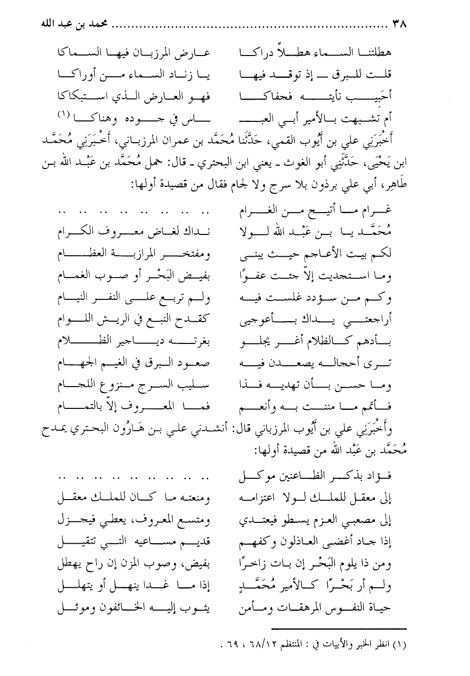 وَأَخْبَرَنِي علي بن أيوب المرزباني قال: أنشدني علي بن هارون البحتري يمدح محمد بن عبد الله من قصيدة أولها: