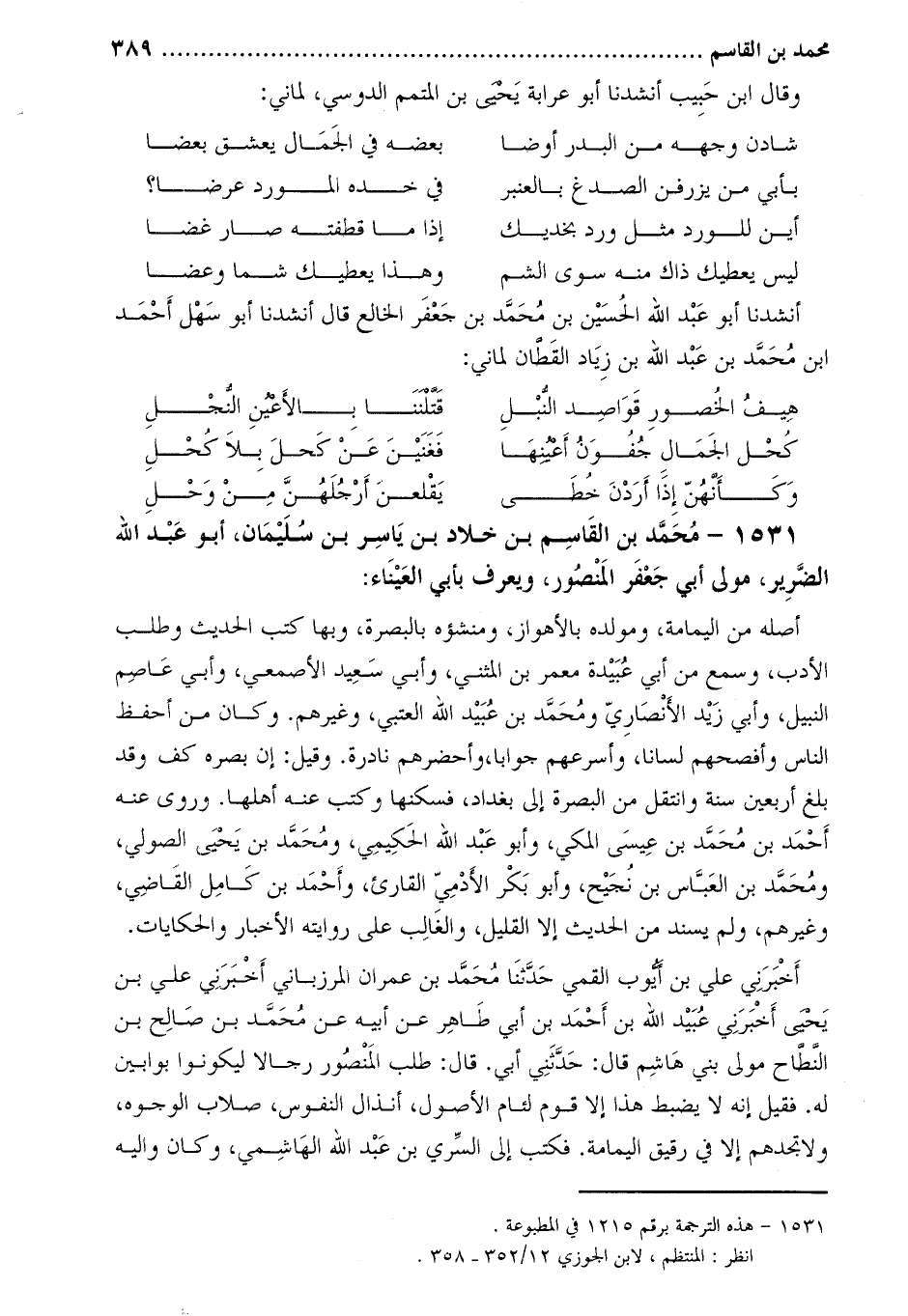 1531- محمد بن القاسم بن خلاد بن ياسر بن سليمان، أبو عبد الله الضرير، مولى أبي جعفر المنصور، ويعرف بأبي العيناء [1] :