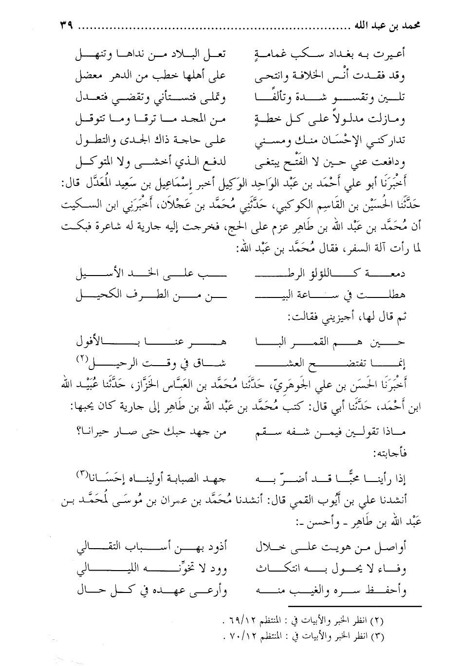 أنشدنا عَلِيّ بْن أَيُّوب القمي قَالَ: أنشدنا محمد بن عمران بن موسى لمحمد بن عبد الله بن طاهر- وأحسن-:
