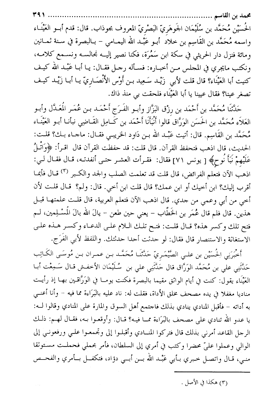 حَدَّثَنَا مُحَمَّدُ بْنُ أَحْمَدَ بْنِ رِزْقٍ الْبَزَّازُ وَأَبُو الفرج أحمد بن عمر المعدل وأبو العلاء محمد بن الحسن الورّاق قالوا أنبأنا أحمد بن كامل القاضي نبأنا أبو العيناء محمد بن القاسم. قَالَ: أتيت عَبْد الله بْن داود الخريبي فقال: ما جاء بك؟ قلت: