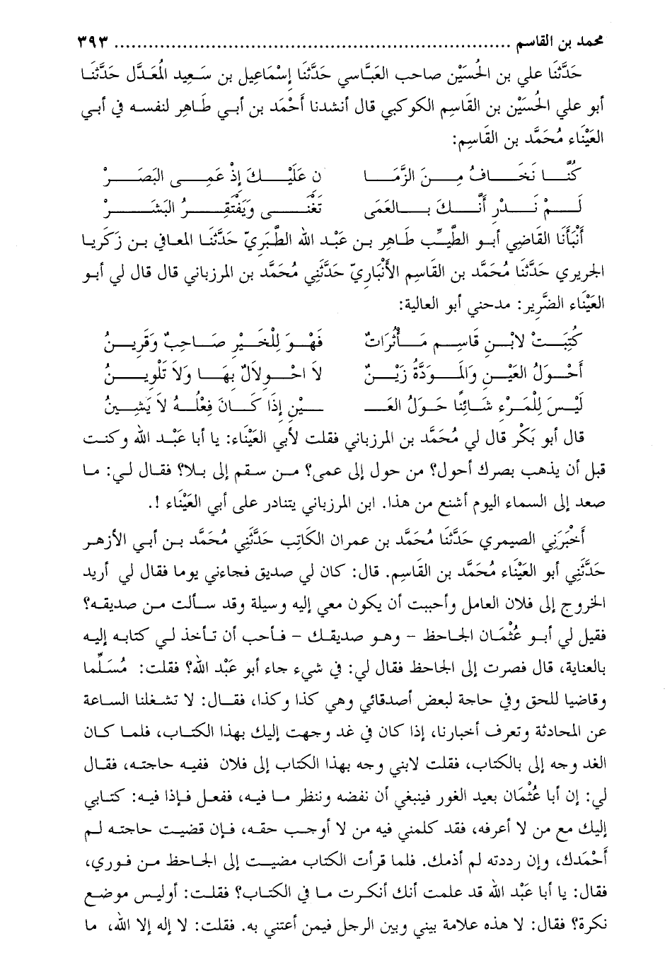 حدّثنا علي بن الحسين صاحب العبّاسي حدّثنا إسماعيل بن سعيد المعدّل حدثنا أَبُو عَلِيٍّ الْحُسَيْنُ بْنُ الْقَاسِمِ الْكَوْكَبِيُّ قَالَ أنشدنا أحمد بن أبي طاهر لنفسه في أبي العيناء محمد بن القاسم: