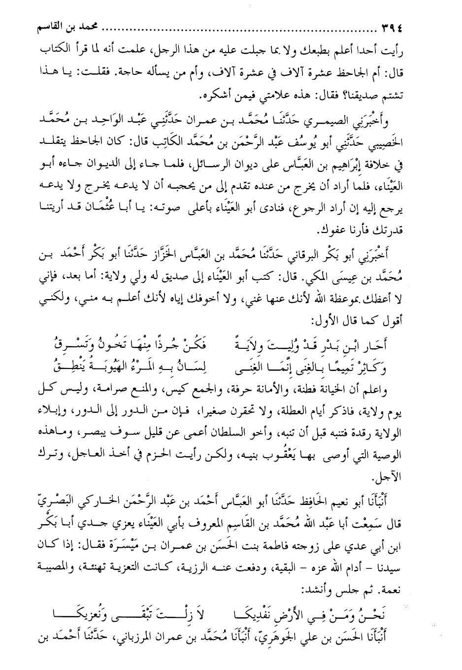 أَخْبَرَنِي أبو بكر البرقاني حدّثنا محمّد بن العبّاس الخزّاز حَدَّثَنَا أبو بكر أحمد بن محمد بن عيسى المكي. قَالَ: كتب أبو العيناء إلى صديق له ولي ولاية: أما بعد، فإني لا أعظك بموعظة الله لأنك عنها غنى، ولا أخوفك إياه لأنك أعلم به مني، ولكني أقول كما قَالَ الأول: