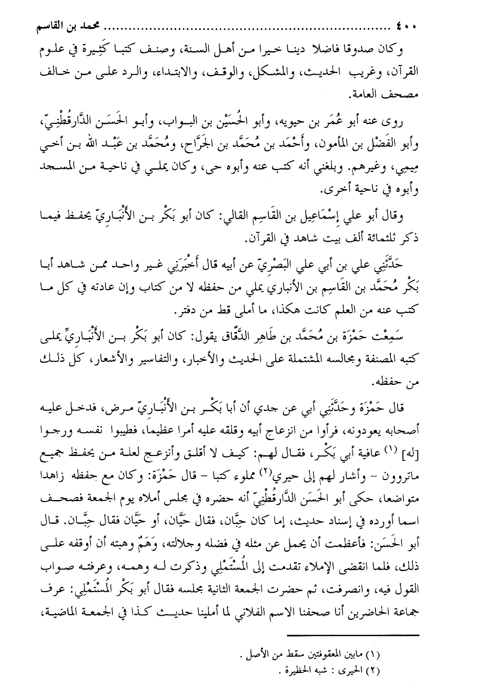 حَدَّثَنِي علي بْن أَبِي علي البصري عَن أَبِيهِ قَالَ أَخْبَرَنِي غير واحد ممن شاهد أبا بكر محمّد بن القاسم بن الأنباري يملى من حفظه لا من كتاب وأن عادته في كل ما كتب عنه من العلم كانت هكذا، ما أملى قط من دفتر.
