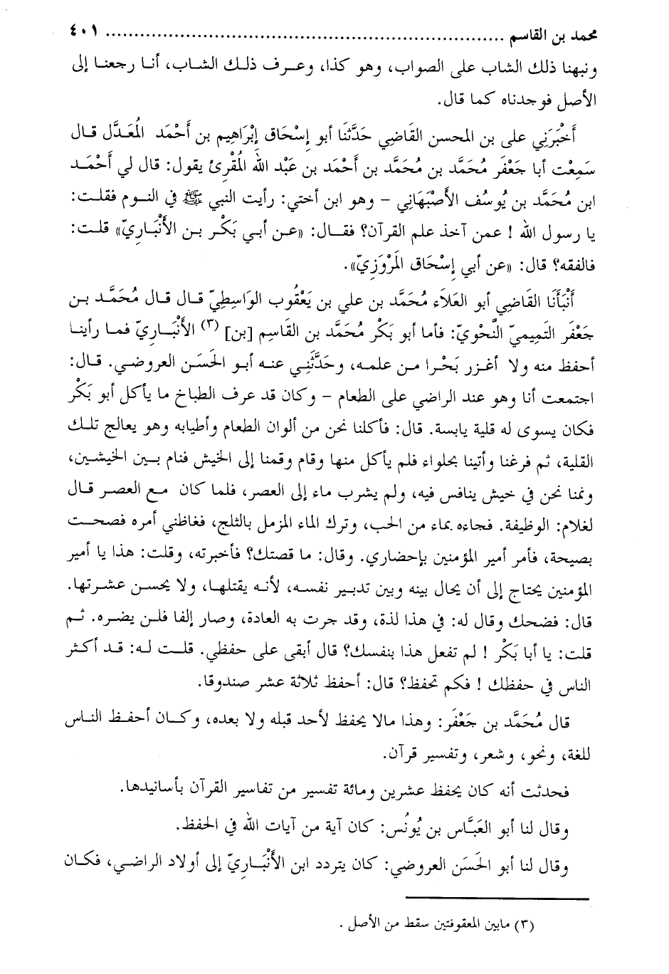 . أَنْبَأَنَا الْقَاضِي أَبُو الْعَلاءِ مُحَمَّدُ بْنُ عَلِيِّ بْنِ يعقوب الواسطي قَالَ قَالَ محمد بن جعفر التميمي النحوي: فأما أبو بكر محمد بن القاسم [بن] [1] الأنباري فما رأينا أحفظ منه ولا أغزر بحرا من علمه، وَحَدَّثَنِي عنه أبو الحسن العروضي. قَالَ: