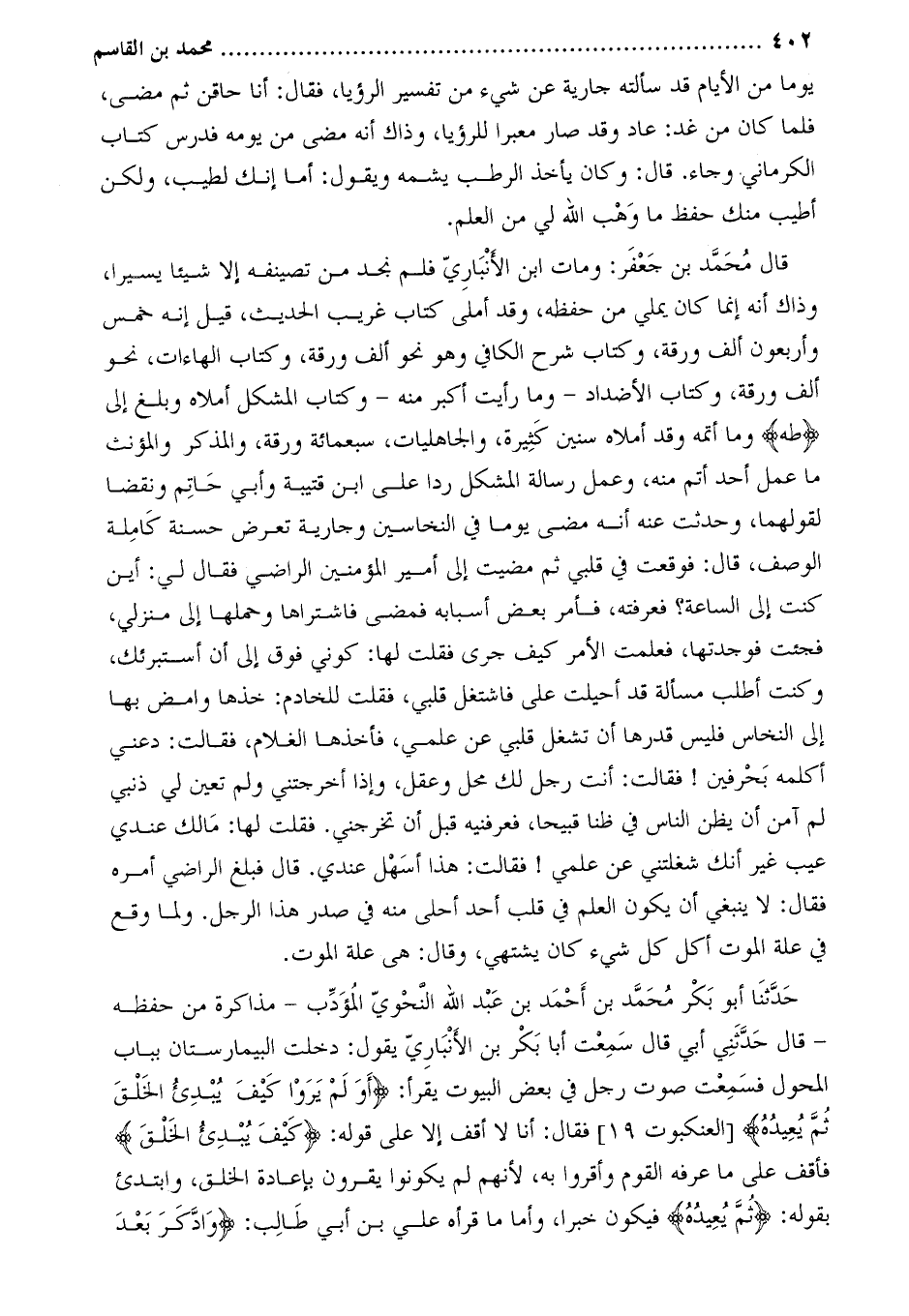 حَدَّثَنَا أَبُو بَكْرٍ مُحَمَّدُ بْنُ أَحْمَدَ بْنِ عبد الله النحوي المؤدب- مذاكرة من حفظه- قَالَ حَدَّثَنِي أبي قَالَ سمعت أبا بكر بن الأنباري يقول: دخلت البيمارستان بباب المحول فسمعت صوت رجل في بعض البيوت يقرأ: أَوَلَمْ يَرَوْا كَيْفَ يُبْدِئُ اللَّهُ الْخَلْقَ ثُمَّ يُعِيدُهُ