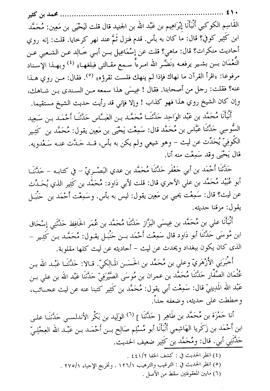 القاسم الكوكبي أنبأنا إبراهيم بن عبد الله بن الجنيد قال قلت ليحيى بن معين: محمّد ابن كَثِيرٍ كُوفِيُّ؟ قَالَ: مَا كَانَ بِهِ بَأْسٌ. قَدِمَ فَنَزَلَ ثُمَّ عِنْدَ نَهْرِ كَرْخَايَا. قُلْتُ: إِنَّهُ رَوَى أَحَادِيثَ مُنْكَرَاتٍ؟ قَالَ: مَا هِيَ؟ قُلْتُ عَنْ إِسْمَاعِيلَ بْنِ أَبِي خَالِدٍ عَنِ الشَّعْبِيِّ عَنِ النُّعْمَانِ بْنِ بَشِيرٍ يَرْفَعُهُ «نَضَّرَ اللَّهُ امْرَأً سَمِعَ مَقَالَتِي فَبَلَّغَهَا» [1] وَبِهَذَا الإِسْنَادِ مَرْفُوعًا: «اقْرَإِ الْقُرْآنَ مَا نَهَاكَ فَإِذَا لَمْ يَنْهَكْ فَلَسْتَ تَقْرَؤُهُ» [2] . فَقَالَ: مَنْ رَوَى هَذَا عَنْهُ؟ فَقُلْتُ: رَجُلٌ مِنْ أَصْحَابِنَا. فَقَالَ! عيسى هَذَا سَمِعَهُ مِنَ السِّنْدِيِّ بْنِ شَاهَكَ، وَإِنْ كَانَ الشَّيْخُ رَوَى هَذَا فَهُوَ كَذَّابٌ! وَإِلا فإني قد رأيت حديث الشيخ مستقيما.