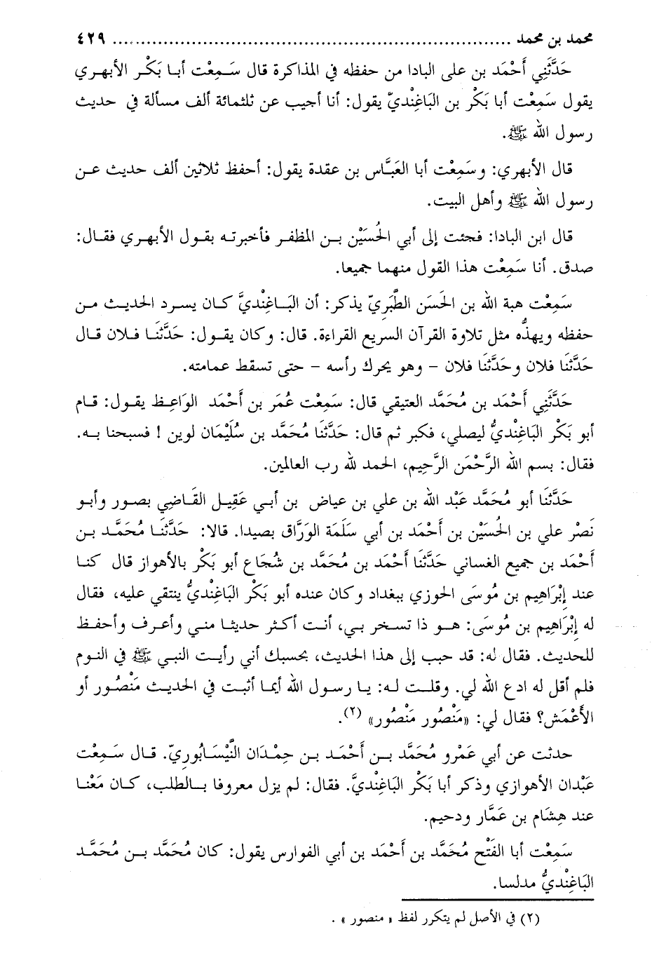 حَدَّثَنَا أَبُو مُحَمَّد عَبْد اللَّه بْن عَلِيّ بْنِ عِيَاضِ بْنِ أَبِي عَقِيلٍ الْقَاضِي بِصُورَ وَأَبُو نَصْرٍ عَلِيُّ بْنُ الْحُسَيْنِ بْنِ أَحْمَدَ بْنِ أَبِي سَلَمَةَ الْوَرَّاقُ بِصَيْدَا. قالا: حَدَّثَنَا مُحَمَّدُ بْنُ أَحْمَدَ بْنِ جُمَيْعٍ الْغَسَّانِيُّ حَدَّثَنَا أحمد بن محمد بن شجاع أبو بكر بالأهواز قَالَ كنا عند إبراهيم بن موسى الحوزي ببغداد وكان عنده أبو بكر الباغندي ينتقى عليه، فقال له إبراهيم بن موسى: هو ذا تسخر بي، أنت أكثر حديثا مني وأعرف وأحفظ للحديث. فقال له: قد حبب إلى هذا الحديث، بحسبك إِنِّي رَأَيْتُ النَّبِيّ صَلَّى اللَّهُ عَلَيْهِ وَسَلَّمَ فِي النوم فلم أقل له ادع الله لي. وقلت له: يا رسول الله أيما أثبت في الحديث منصور أو الأعمش؟ فقال لي: «منصور منصور» [1]