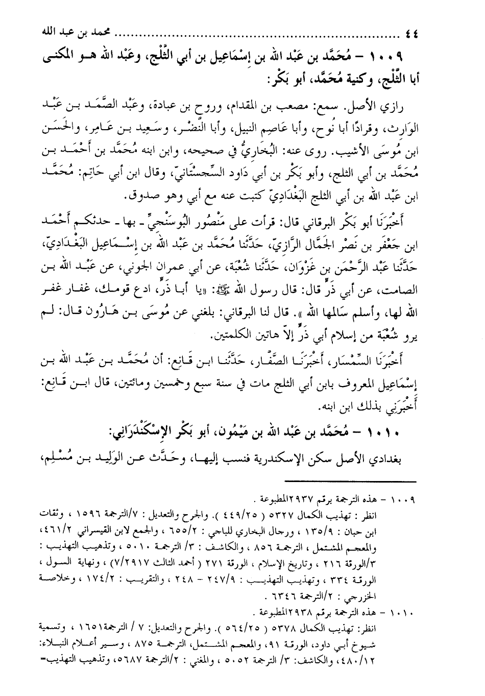 1009- مُحَمَّد بْن عَبْد اللَّهِ بْن إِسْمَاعِيل بْن أبي الثلج، وعبد الله هو المكنى أبا الثلج، وكنية محمد، أبو بكر [1] :