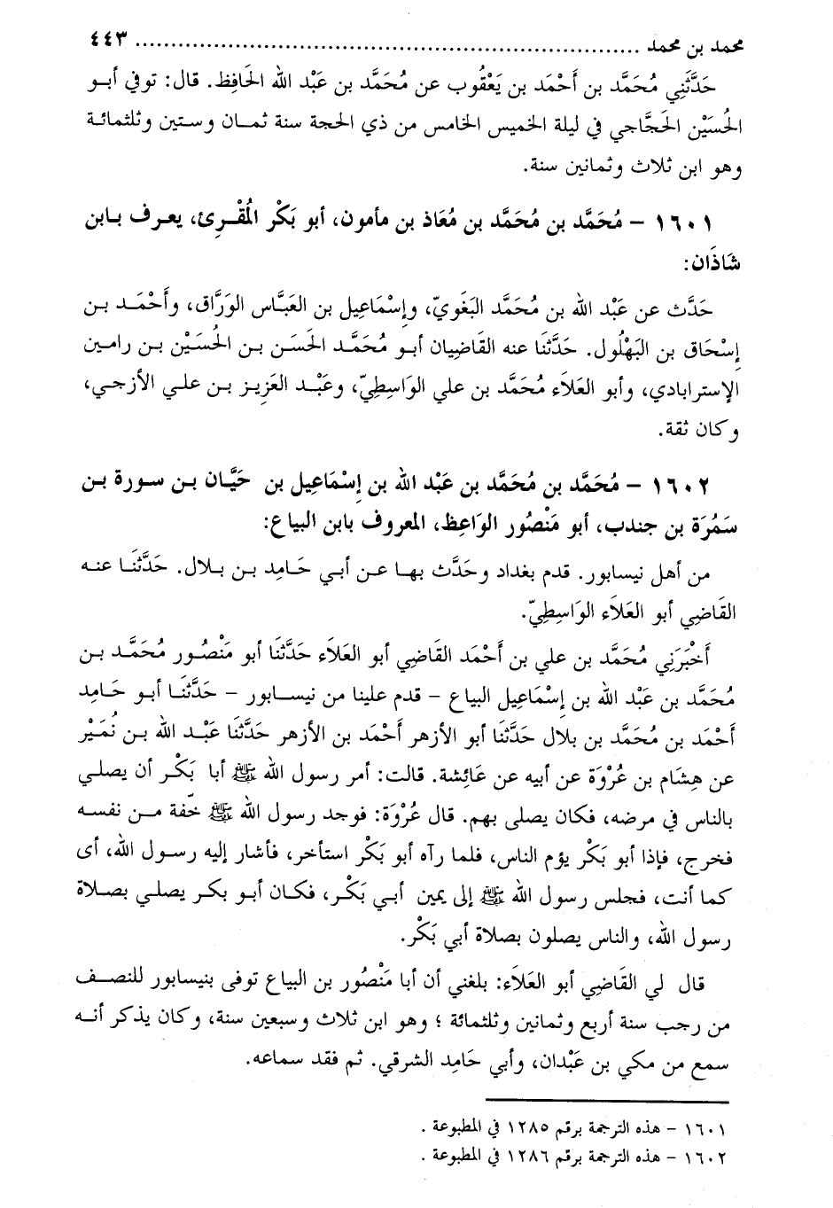 1601- مُحَمَّدُ بْنُ مُحَمَّدِ بْنِ مُعَاذِ بْنِ مَأْمُونٍ، أبو بكر المقرئ، يعرف بابن شاذان [1] :