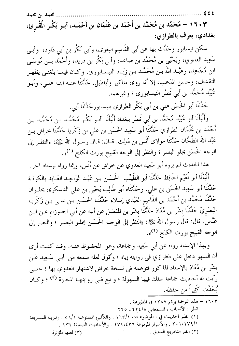 1603- مُحَمَّد بن مُحَمَّدِ بْنِ أَحْمَدَ بْنِ عثمان بن أحمد، أبو بكر المقرئ، بغدادي، يعرف بالطرازي [1] :
