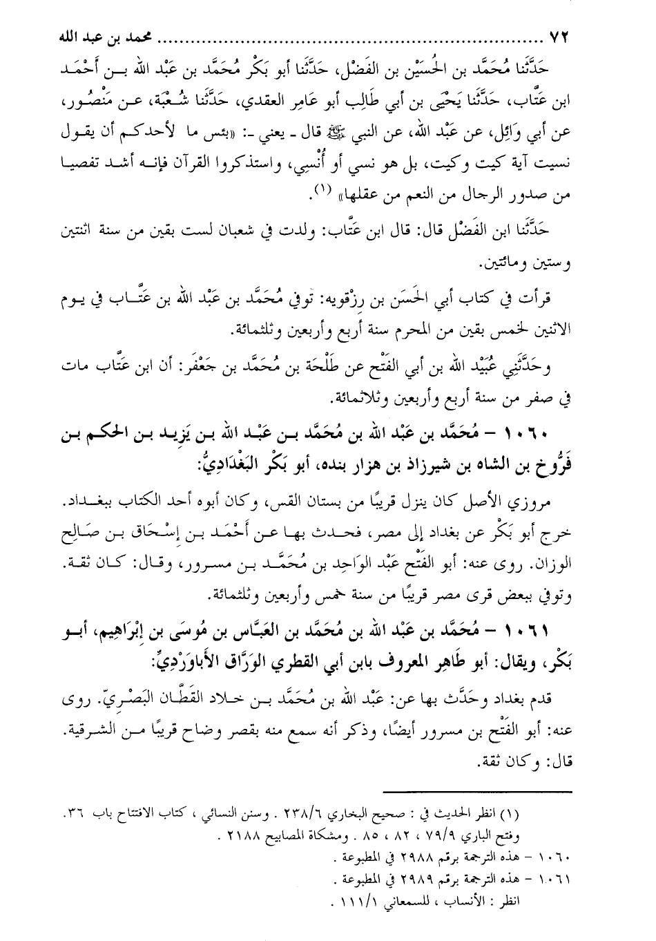 حدّثنا محمّد بن الحسين بن الفضل، حَدَّثَنَا أَبُو بَكْرٍ مُحَمَّد بْن عَبْد اللَّهِ بْنِ أحمد ابن عتّاب، حدّثنا يحيى بن أبي طالب أبو عامر العقدي، حَدَّثَنَا شُعْبَةُ، عَنْ مَنْصُورٍ، عَنْ أَبِي وَائِلٍ، عَنْ عَبْدِ اللَّهِ، عَنِ النَّبِيِّ صَلَّى اللَّهُ عَلَيْهِ وَسَلَّمَ قال- يعني-: «بِئْسَ مَا لأَحَدِكُمْ أَنْ يَقُولَ نَسِيتُ آيَةَ كَيْتَ وَكَيْتَ، بَلْ هُوَ نُسِّيَ أَوْ أُنْسِيَ، وَاسْتَذْكَرُوا الْقُرْآنَ فَإِنَّهُ أَشَدُّ تَفَصِّيًا مِنْ صُدُورِ الرِّجَالِ مِنَ النَّعَمِ مِنْ عُقُلِهَا» [1]