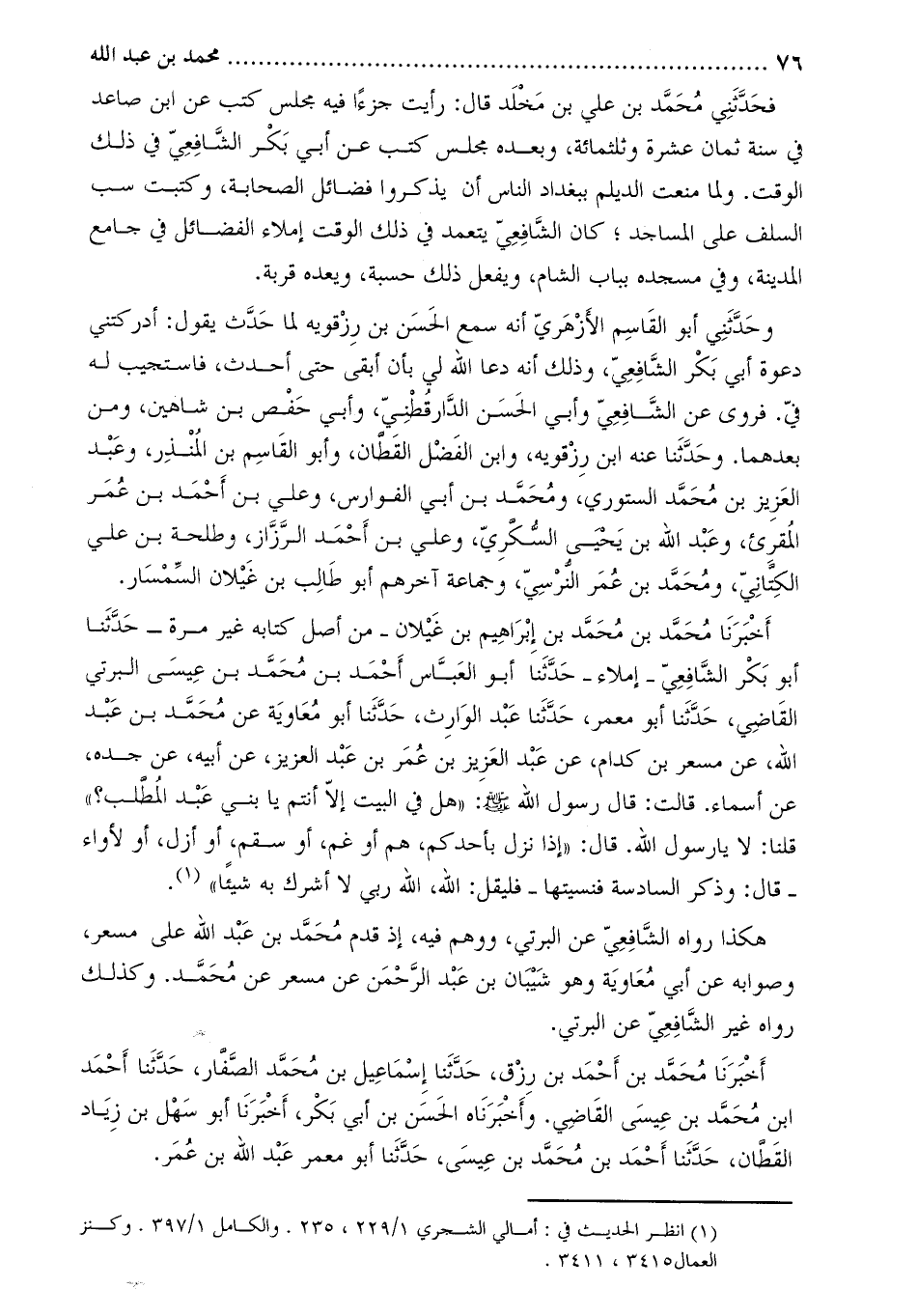 فحدثني محمد بن علي بن مخلد قَالَ: رأيت جزءا فيه مجلس كتب عن ابن صاعد في سنة ثمان عشرة وثلاثمائة، وبعده مجلس كتب عن أبي بكر الشافعي في ذلك الوقت. ولما منعت الديلم ببغداد الناس أن يذكروا فضائل الصحابة، وكتبت سب السلف على المساجد؛ كان الشافعي يتعمد في ذلك الوقت إملاء الفضائل في جامع المدينة، وفي مسجده بباب الشام، ويفعل ذلك حسبة، ويعده قربة.