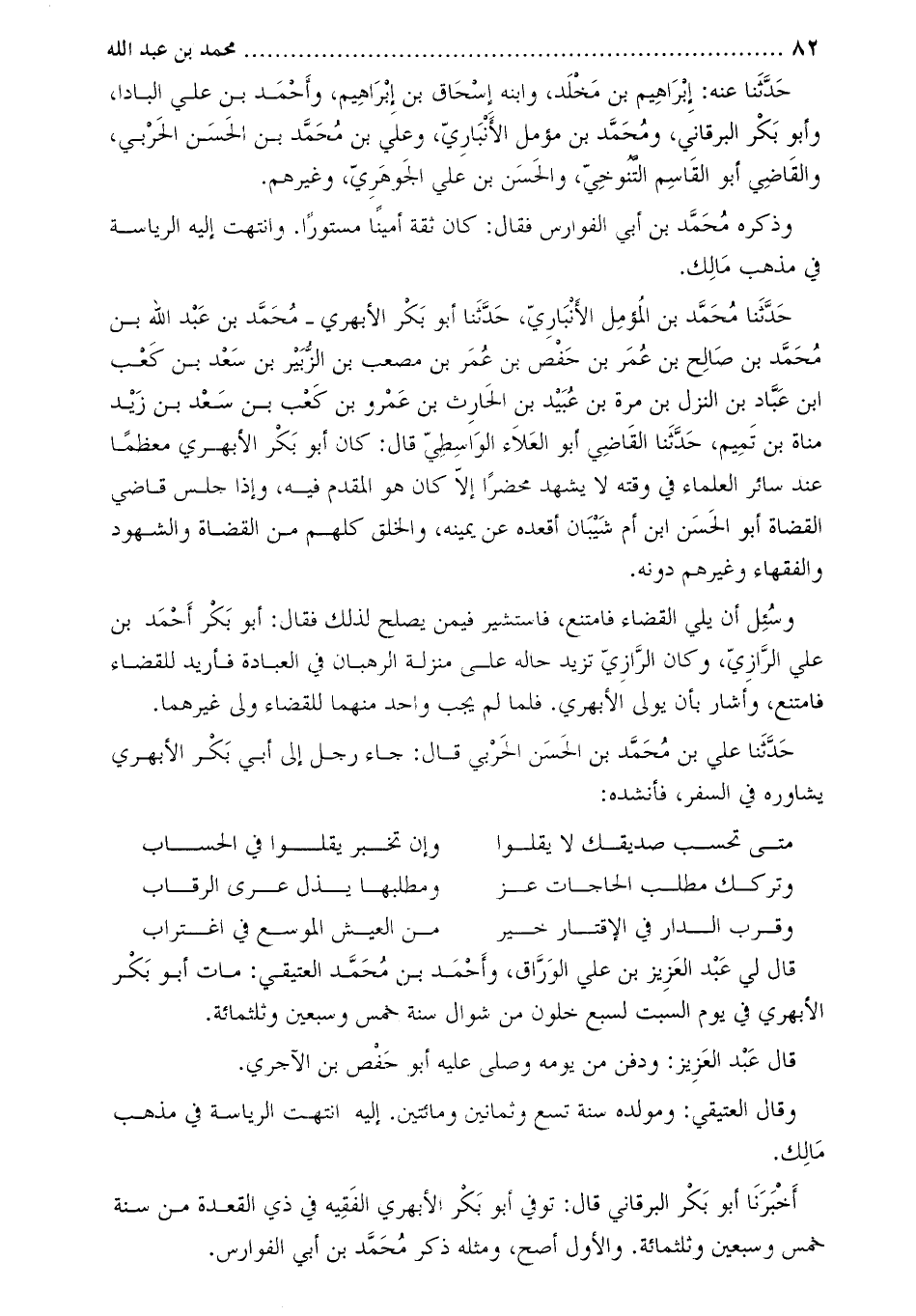 حَدَّثَنَا محمد بن المؤمل الأنباريّ، حَدَّثَنَا أبو بكر الأبهري- مُحَمَّدُ بْنُ عَبْدِ اللَّهِ بْنِ مُحَمَّدِ بْنِ صالح بن عمر بن حفص بن عمر بن مصعب بن الزّبير بن سعد بن كعب ابن عبّاد بن النزل بن مرة بن عبيد بن الحارث بن عمرو بن كعب بن سعد بن زيد مناة بن تميم، حَدَّثَنَا القاضي أبو العلاء الواسطي قَالَ: كان أبو بكر الأبهري معظما عند سائر العلماء في وقته لا يشهد محضرا إلا كان هو المقدم فيه، وإذا جلس قاضي القضاة أبو الحسن ابن أم شيبان أقعده عن يمينه، والخلق كلهم من القضاة والشهود والفقهاء وغيرهم دونه.