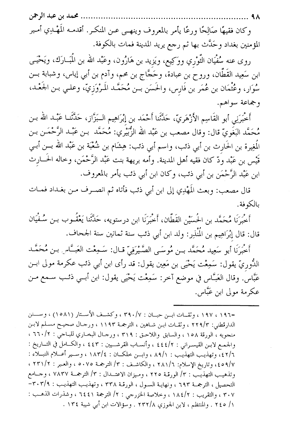 7/459، وتاريخ الإسلام، 6/281، والكاشف: 3/الترجمة 5075، والعبر: 2/231، وتذهيب التهذيب: 3/الورقة 225، وميزان الاعتدال: 3/الترجمة 7837، وجامع التحصيل، الترجمة 693، ونهاية السول، الورقة 338، وتهذيب التهذيب: 9/303- 307، والتقريب: 2/184، وخلاصة الخزرجي: 2/الترجمة 6441، وشذرات الذهب: