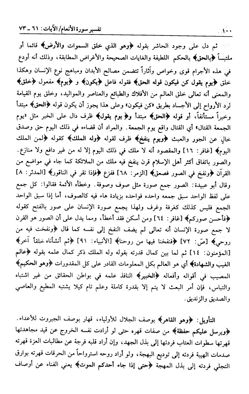 والصور باتفاق أكثر أهل الإسلام قرن ينفخ فيه ملك من الملائكة كما جاء في مواضع من القرآن وَنُفِخَ فِي الصُّورِ فَصَعِقَ [الزمر: 68] ففزع فَإِذا نُقِرَ فِي النَّاقُورِ [المدثر: 8] وقال أبو عبيدة: الصور جمع صورة مثل صوف وصوفة. وخطأه الأئمة فقالوا: كل جمع على لفظ الواحد سبق جمعه واحده فواحده بزيادة هاء فيه كالصوف، أما إذا سبق الواحد الجمع فليس كذلك كغرفة وغرف ولهذا يجمع صورة الإنسان على صور بالفتح كقوله فَأَحْسَنَ صُوَرَكُمْ [غافر: 64] ومن أسكن فقد أخطأ، ومما يدل على أن الصور هو القرن لا جمع صورة الإنسان أنه تعالى لم يضف النفخ إلى نفسه كما قال وَنَفَخْتُ فِيهِ مِنْ رُوحِي [ص: 72] فَنَفَخْنا فِيها مِنْ رُوحِنا [الأنبياء: 91] ثُمَّ أَنْشَأْناهُ خَلْقاً آخَرَ [المؤمنون: 14] ثم لما بين كمال قدرته بقوله وله الملك ذكر كمال علمه بقوله عالِمُ الْغَيْبِ وَالشَّهادَةِ أي هو العالم بكل المعلومات القادر على كل المقدورات وَهُوَ الْحَكِيمُ المصيب في أقواله وأفعاله الْخَبِيرُ النافذ علمه في بواطن الحقائق من غير اشتباه والتباس، فإن أمر البعث لا يتم إلا بقدرة كاملة وعلم تام كيلا يشتبه المطيع والعاصي والصديق والزنديق.
