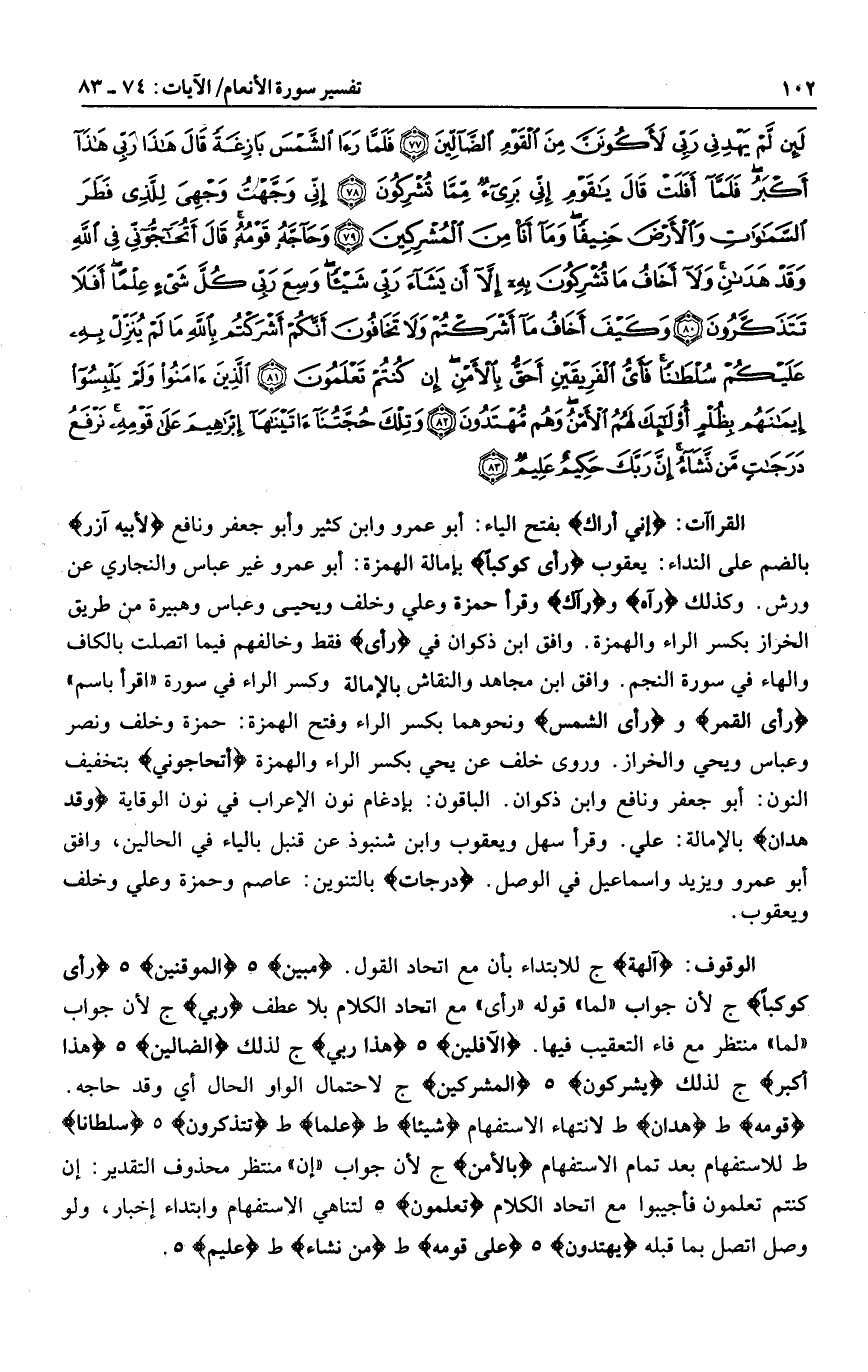 إِنِّي أَراكَ بفتح الياء: أبو عمرو وابن كثير وأبو جعفر ونافع لِأَبِيهِ آزَرَ بالضم على النداء: يعقوب رَأى كَوْكَباً بإمالة الهمزة: أبو عمرو غير عباس والنجاري عن ورش. وكذلك رَآهُ ورَآكَ وقرأ حمزة وعلي وخلف ويحيى وعباس وهبيرة من طريق الخراز بكسر الراء والهمزة. وافق ابن ذكوان في رَأى فقط وخالفهم فيما اتصلت بالكاف والهاء في سورة النجم. وافق ابن مجاهد والنقاش بالإمالة وكسر الراء في سورة «اقرأ باسم» رَأَى الْقَمَرَ ورَأَى الشَّمْسَ ونحوهما بكسر الراء وفتح الهمزة: حمزة وخلف ونصر وعباس ويحي والخراز. وروى خلف عن يحي بكسر الراء والهمزة أَتُحاجُّونِّي بتخفيف النون: أبو جعفر ونافع وابن ذكوان. الباقون: بإدغام نون الإعراب في نون الوقاية وَقَدْ هَدانِ بالإمالة: علي. وقرأ سهل ويعقوب وابن شنبوذ عن قنبل بالياء في الحالين، وافق أبو عمرو ويزيد وإسماعيل في الوصل. دَرَجاتٍ بالتنوين: عاصم وحمزة وعلي وخلف ويعقوب.