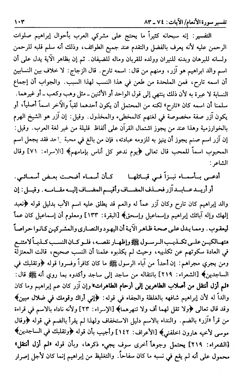 وإن آزر كان عم إبراهيم وما كان والدا له لأن إبراهيم شافهه بالغلظة والجفاء في قوله: إِنِّي أَراكَ وَقَوْمَكَ فِي ضَلالٍ مُبِينٍ وقد قال تعالى فَلا تَقُلْ لَهُما أُفٍّ وَلا تَنْهَرْهُما [الإسراء: 23] ولأنه ناداه بالاسم في قراءة من قرأ «آزر» بالضم. والنداء بالاسم دليل الاستخفاف ولهذا لم يقرأ بالضم في قوله وَقالَ مُوسى لِأَخِيهِ هارُونَ اخْلُفْنِي [الأعراف: 142] وأجيب بأن قوله وَتَقَلُّبَكَ فِي السَّاجِدِينَ [الشعراء: 219] يحتمل وجوها أخرى سوف يجيء ذكرها، وبأن