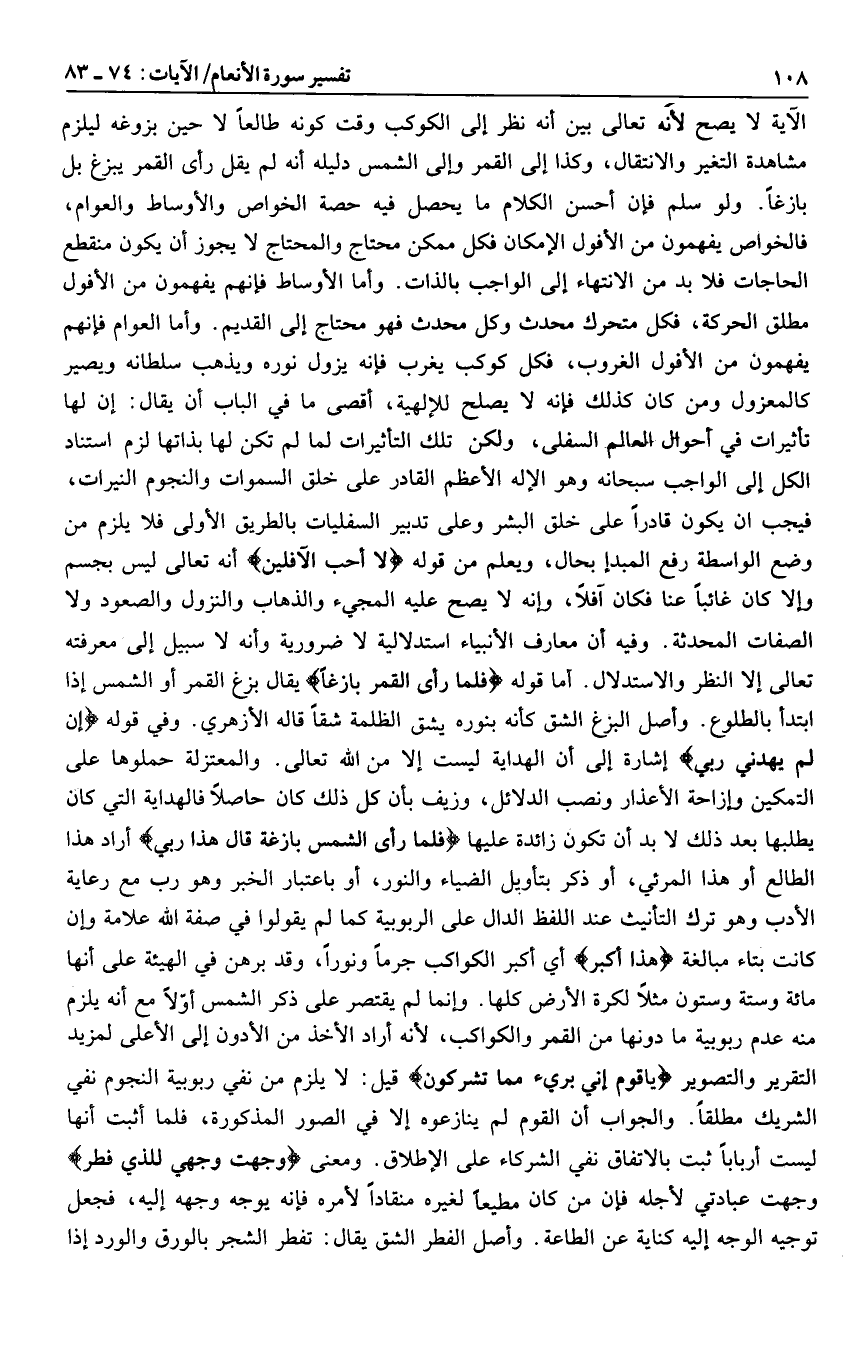 الآية لا يصح لأنه تعالى بين أنه نظر إلى الكوكب وقت كونه طالعا لا حين بزوغه ليلزم مشاهدة التغير والانتقال، وكذا إلى القمر وإلى الشمس دليله أنه لم يقل رأى القمر يبزغ بل بازغا. ولو سلم فإن أحسن الكلام ما يحصل فيه حصة الخواص والأوساط والعوام، فالخواص يفهمون من الأفول الإمكان فكل ممكن محتاج والمحتاج لا يجوز أن يكون منقطع الحاجات فلا بد من الانتهاء إلى الواجب بالذات. وأما الأوساط فإنهم يفهمون من الأفول مطلق الحركة، فكل متحرك محدث وكل محدث فهو محتاج إلى القديم. وأما العوام فإنهم يفهمون من الأفول الغروب، فكل كوكب يغرب فإنه يزول نوره ويذهب سلطانه ويصير كالمعزول ومن كان كذلك فإنه لا يصلح للإلهية، أقصى ما في الباب أن يقال: إن لها تأثيرات في أحوال العالم السفلى، ولكن تلك التأثيرات لما لم تكن لها بذاتها لزم استناد الكل إلى الواجب سبحانه وهو الإله الأعظم القادر على خلق السموات والنجوم النيرات، فيجب ان يكون قادرا على خلق البشر وعلى تدبير السفليات بالطريق الأولى فلا يلزم من وضع الواسطة رفع المبدإ بحال، ويعلم من قوله لا أُحِبُّ الْآفِلِينَ أنه تعالى ليس بجسم وإلا كان غائبا عنا فكان آفلا، وإنه لا يصح عليه المجيء والذهاب والنزول والصعود ولا الصفات المحدثة. وفيه أن معارف الأنبياء استدلالية لا ضرورية وأنه لا سبيل إلى معرفته تعالى إلا النظر والاستدلال. أما قوله فَلَمَّا رَأَى الْقَمَرَ بازِغاً يقال بزغ القمر أو الشمس إذا