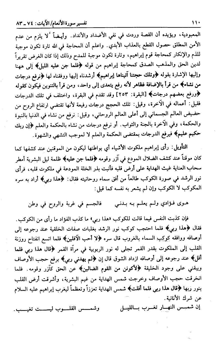 فقال هذا رَبِّي فلما احتجب كوكب نور الرشد بغلبات صفات الخلقية عند رجوعه إلى أوصافه ووافقه كوكب السماء بالغروب قال سره لا أُحِبُّ الْآفِلِينَ فلما اتسع انفتاح روزنة القلب إلى الملكوت بقدر القمر تجلى له نور الربوبية في مرآة القمر قالَ هذا رَبِّي فَلَمَّا أَفَلَ عند رجوعه إلى أوصافه ازداد الشوق قال إن لَمْ يَهْدِنِي رَبِّي برفع حجب الأوصاف ويبقني على وجود الخليقة لَأَكُونَنَّ مِنَ الْقَوْمِ الضَّالِّينَ عن الحق كآزر وقومه. فلما انخرقت حجب الأوصاف وخرجت شمس الهداية من غيم البشرية، وأشرقت أرض القلب بنور ربها قالَ هذا رَبِّي هذا أَكْبَرُ فَلَمَّا أَفَلَتْ شمس الهداية تعززا وتعظما ليغرب إبراهيم عليه السلام عن شرك الأنانية.