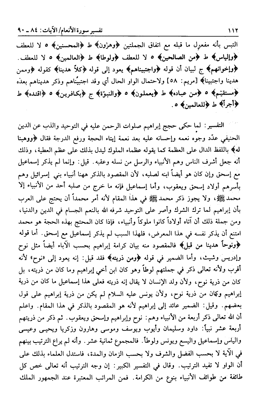 لما حكى حجج إبراهيم صلوات الرحمن عليه في التوحيد والذب عن الدين الحنيفي عدّد وجوه نعمه وإحسانه عليه بعد نعمة إيتاء الحجة ورفع الدرجة فقال وَوَهَبْنا لَهُ باللفظ الدال على العظمة كما يقوله عظماء الملوك ليدل بذلك على عظم العطية، وذلك أنه جعل أشرف الناس وهم الأنبياء والرسل من نسله وعقبه. قيل: وإنما لم يذكر إسماعيل مع إسحق وإن كان هو أيضا ابنه لصلبه، لأن المقصود بالذكر هاهنا أنبياء بني إسرائيل وهم بأسرهم أولاد إسحق ويعقوب، وأما إسماعيل فإنه ما خرج من صلبه أحد من الأنبياء إلا محمد صلى الله عليه وسلم، ولا يجوز ذكر محمد صلى الله عليه وسلم في هذا المقام لأنه أمر محمدا أن يحتج على العرب بأن إبراهيم لما ترك الشرك وأصر على التوحيد شرفه الله بالنعم الجسام في الدين والدنيا، ومن جملة ذلك أن آتاه أولادا كانوا ملوكا وأنبياء، فإذا كان المحتج بهذه الحجة هو محمد امتنع أن يذكر نفسه في هذا المعرض، فلهذا السبب لم يذكر إسماعيل مع إسحق. أما قوله وَنُوحاً هَدَيْنا مِنْ قَبْلُ فالمقصود منه بيان كرامة إبراهيم بحسب الآباء أيضا مثل نوح وإدريس وشيث، وأما الضمير في قوله وَمِنْ ذُرِّيَّتِهِ فقد قيل: إنه يعود إلى «نوح» لأنه أقرب ولأنه تعالى ذكر في جملتهم لوطا وهو كان ابن أخي إبراهيم وما كان من ذريته، بل كان من ذرية نوح، ولأن ولد الإنسان لا يقال إنه ذريته فعلى هذا إسماعيل ما كان من ذرية إبراهيم وكان من ذرية نوح، ولأن يونس عليه السلام لم يكن من ذرية إبراهيم على قول بعضهم. وقيل: الضمير عائد إلى إبراهيم لأنه هو المقصود بالذكر في هذا المقام. واعلم أن الله تعالى ذكر أربعة من الأنبياء وهم: نوح وإبراهيم وإسحق ويعقوب. ثم ذكر من ذريتهم أربعة عشر نبيا: داود وسليمان وأيوب ويوسف وموسى وهارون وزكريا ويحيى وعيسى والياس وإسماعيل واليسع ويونس ولوطا. فالمجموع ثمانية عشر. وأنه لم يراع الترتيب بينهم في الآية لا بحسب الفضل والشرف ولا بحسب الزمان والمدة، فاستدل العلماء بذلك على أن الواو لا تفيد الترتيب. وقال في التفسير الكبير: إن وجه الترتيب أنه تعالى خص كل طائفة من طوائف الأنبياء بنوع من الكرامة. فمن المراتب المعتبرة عند الجمهور الملك