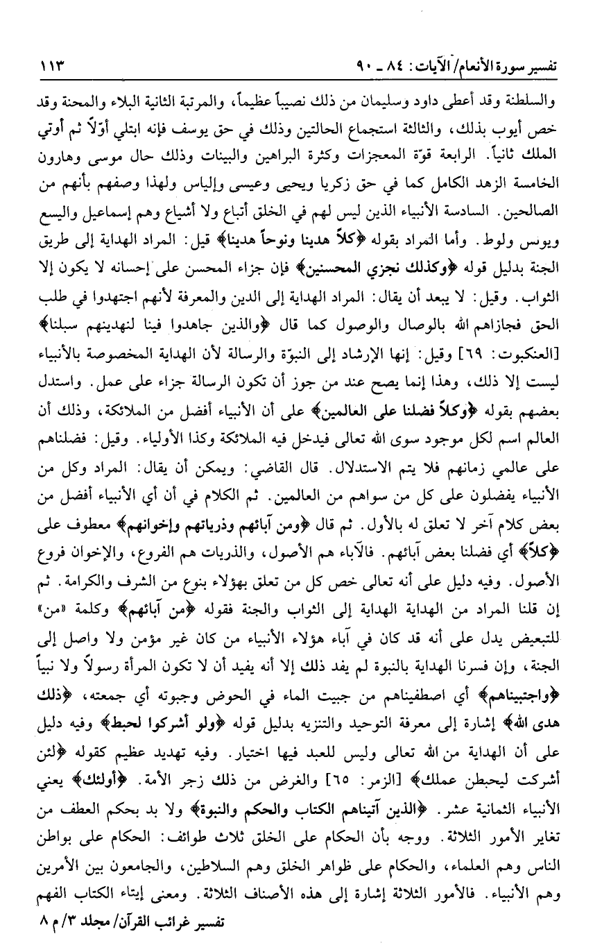 وكلمة «من» للتبعيض يدل على أنه قد كان في آباء هؤلاء الأنبياء من كان غير مؤمن ولا واصل إلى الجنة، وإن فسرنا الهداية بالنبوة لم يفد ذلك إلا أنه يفيد أن لا تكون المرأة رسولا ولا نبيا وَاجْتَبَيْناهُمْ أي اصطفيناهم من جبيت الماء في الحوض وجبوته أي جمعته، ذلِكَ هُدَى اللَّهِ إشارة إلى معرفة التوحيد والتنزيه بدليل قوله وَلَوْ أَشْرَكُوا لَحَبِطَ وفيه دليل على أن الهداية من الله تعالى وليس للعبد فيها اختيار. وفيه تهديد عظيم كقوله لَئِنْ أَشْرَكْتَ لَيَحْبَطَنَّ عَمَلُكَ [الزمر: 65] والغرض من ذلك زجر الأمة. أُولئِكَ يعني الأنبياء الثمانية عشر. الَّذِينَ آتَيْناهُمُ الْكِتابَ وَالْحُكْمَ وَالنُّبُوَّةَ ولا بد بحكم العطف من تغاير الأمور الثلاثة. ووجه بأن الحكام على الخلق ثلاث طوائف: الحكام على بواطن الناس وهم العلماء، والحكام على ظواهر الخلق وهم السلاطين، والجامعون بين الأمرين وهم الأنبياء. فالأمور الثلاثة إشارة إلى هذه الأصناف الثلاثة. ومعنى إيتاء الكتاب الفهم