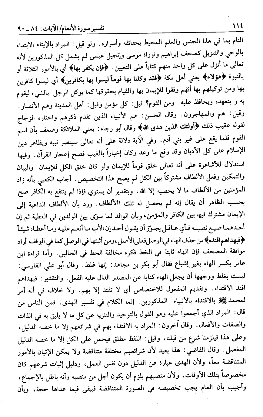 وقيل: هم والمهاجرون. وقال الحسن: هم الأنبياء الذين تقدم ذكرهم واختاره الزجاج لقوله عقيب ذلك أُولئِكَ الَّذِينَ هَدَى اللَّهُ وقال أبو رجاء: يعني الملائكة وضعف بأن اسم القوم قلما يقع على غير بني آدم. وفي الآية دلالة على أنه تعالى سينصر نبيه ويظاهر دين الإسلام على كل الأديان وقد وقع ما وعد وكان إخبارا بالغيب فصح إعجاز القرآن. وفيها استدلال للأشاعرة على أنه تعالى خلق قوما للإيمان ولو كان خلق الكل للإيمان والبيان والتمكين وفعل الألطاف مشتركا بين الكل لم يصح هذا التخصيص. أجاب الكعبي بأنه زاد المؤمنين من الألطاف ما لا يحصيه إلا الله، وبتقدير أن يستوي فإذا لم ينتفع به الكافر صح بحسب الظاهر أن يقال إنه لم يحصل له تلك الألطاف. ورد بأن الألطاف الداعية إلى الإيمان مشترك فيها بين الكافر والمؤمن، وبأن الوالد لما سوّى بين الولدين في العطية ثم إن أحدهما ضيع نصيبه فأي عاقل يجوّز أن يقول أحد إن الأب ما أنعم عليه وما أعطاه شيئا فَبِهُداهُمُ اقْتَدِهْ من حذف الهاء في الوصل فعلى الأصل، ومن أثبتها في الوصل كما في الوقف أراد موافقة المصحف فإن الهاء ثابتة في الخط فكره مخالفة الخط في الحالين. وأما قراءة ابن عامر بكسر الهاء بغير إشباع فقال أبو بكر بن مجاهد: إنها غلط. وقال أبو علي الفارسي: