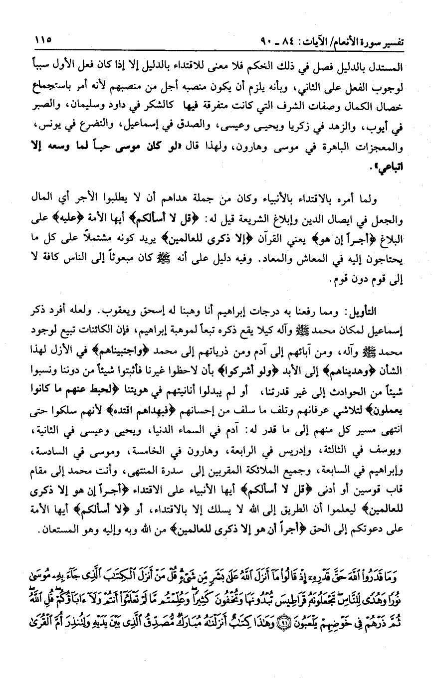 ومما رفعنا به درجات إبراهيم أنا وهبنا له إسحق ويعقوب. ولعله أفرد ذكر إسماعيل لمكان محمد صلى الله عليه وسلم وآله كيلا يقع ذكره تبعا لموهبة إبراهيم، فإن الكائنات تبيع لوجود محمد صلى الله عليه وسلم وآله، ومن آبائهم إلى آدم ومن ذرياتهم إلى محمد وَاجْتَبَيْناهُمْ في الأزل لهذا الشأن وَهَدَيْناهُمْ إلى الأبد وَلَوْ أَشْرَكُوا بأن لاحظوا غيرنا فأثبتوا شيئا من دوننا ونسبوا شيئا من الحوادث إلى غير قدرتنا، أو لم يبدلوا أنانيتهم في هويتنا لَحَبِطَ عَنْهُمْ ما كانُوا يَعْمَلُونَ لتلاشي عرفانهم وتلف ما سلف من إحسانهم فَبِهُداهُمُ اقْتَدِهْ لأنهم سلكوا حتى انتهى مسير كل منهم إلى ما قدر له: آدم في السماء الدنيا، ويحيى وعيسى في الثانية، ويوسف في الثالثة، وإدريس في الرابعة، وهارون في الخامسة، وموسى في السادسة، وإبراهيم في السابعة، وجميع الملائكة المقربين إلى سدرة المنتهى، وأنت محمد إلى مقام قاب قوسين أو أدنى قُلْ لا أَسْئَلُكُمْ أيها الأنبياء على الاقتداء أَجْراً إِنْ هُوَ إِلَّا ذِكْرى لِلْعالَمِينَ ليعلموا أن الطريق إلى الله لا يسلك إلا بالاقتداء، أو لا أَسْئَلُكُمْ أيها الأمة على دعوتكم إلى الحق أَجْراً إِنْ هُوَ إِلَّا ذِكْرى لِلْعالَمِينَ من الله وبه وإليه وهو المستعان.