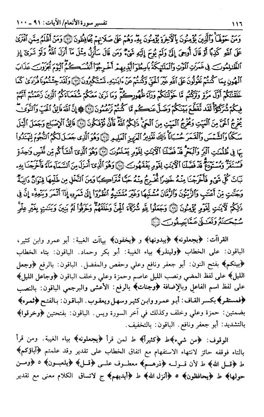 يجعلونه يبدونها ويخفون بياءات الغيبة: أبو عمرو وابن كثير، الباقون: على الخطاب ولينذر بياء الغيبة: أبو بكر وحماد. الباقون: بتاء الخطاب بَيْنَكُمْ بفتح النون: أبو جعفر ونافع وعلي وحفص والمفضل. الباقون: بالرفع وَجَعَلَ اللَّيْلَ على لفظ المضي ونصب الليل عاصم وحمزة وعلي وخلف الباقون وجاعل الليل على لفظ اسم الفاعل وبالإضافة وَجَنَّاتٍ بالرفع: الأعشى والبرجمي الباقون: بالنصب فَمُسْتَقَرٌّ بكسر القاف: أبو عمرو وابن كثير وسهل ويعقوب. الباقون: بالفتح ثَمَرِهِ بضمتين: حمزة وعلي وخلف وكذلك في آخر السورة ويس. الباقون: بفتحتين وَخَرَقُوا بالتشديد: أبو جعفر ونافع. الباقون: بالتخفيف.