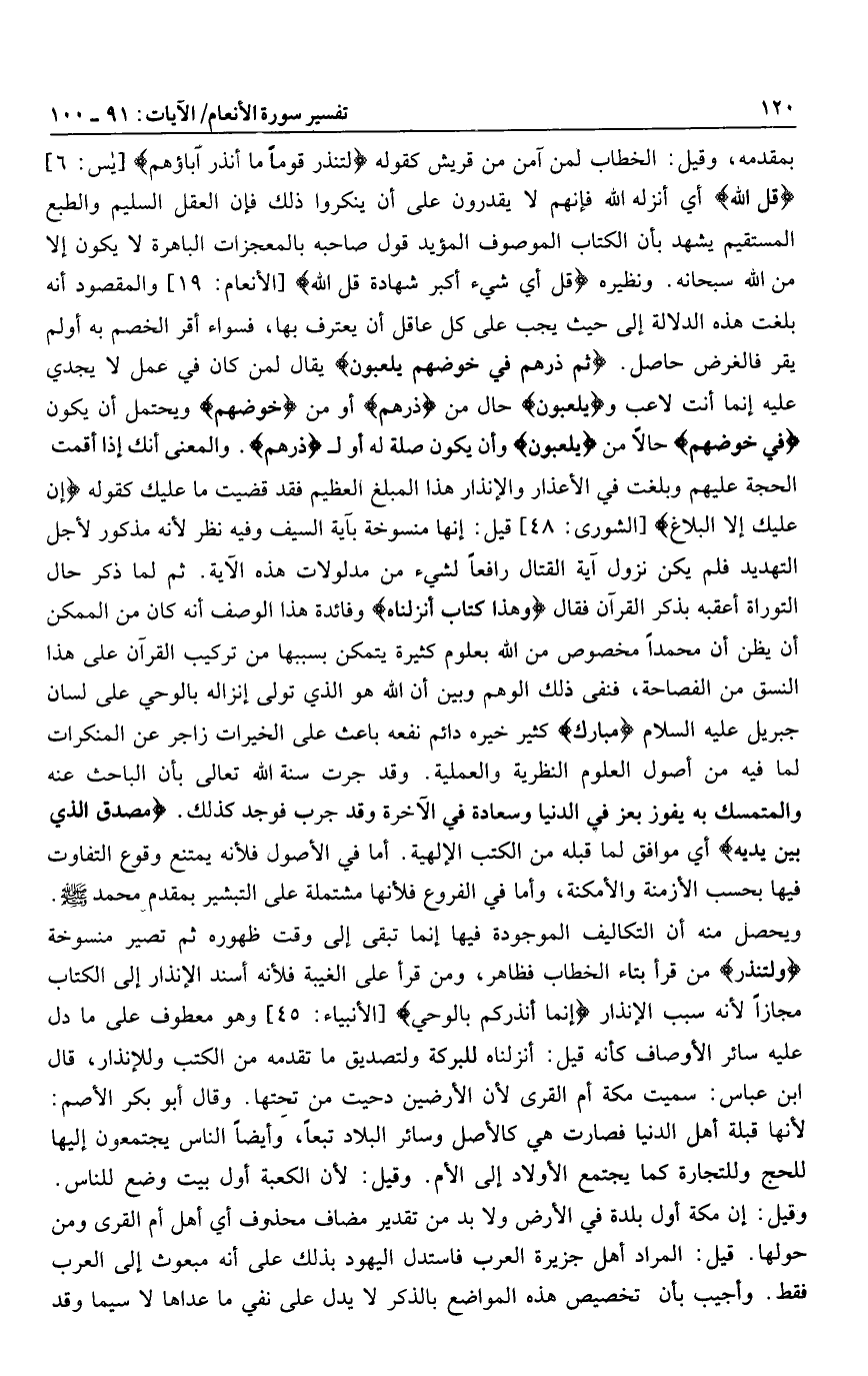 ويحصل منه أن التكاليف الموجودة فيها إنما تبقى إلى وقت ظهوره ثم تصير منسوخة وَلِتُنْذِرَ من قرأ بتاء الخطاب فظاهر، ومن قرأ على الغيبة فلأنه أسند الإنذار إلى الكتاب مجازا لأنه سبب الإنذار إِنَّما أُنْذِرُكُمْ بِالْوَحْيِ [الأنبياء: 45] وهو معطوف على ما دل عليه سائر الأوصاف كأنه قيل: أنزلناه للبركة ولتصديق ما تقدمه من الكتب وللإنذار، قال ابن عباس: سميت مكة أم القرى لأن الأرضين دحيت من تحتها. وقال أبو بكر الأصم: