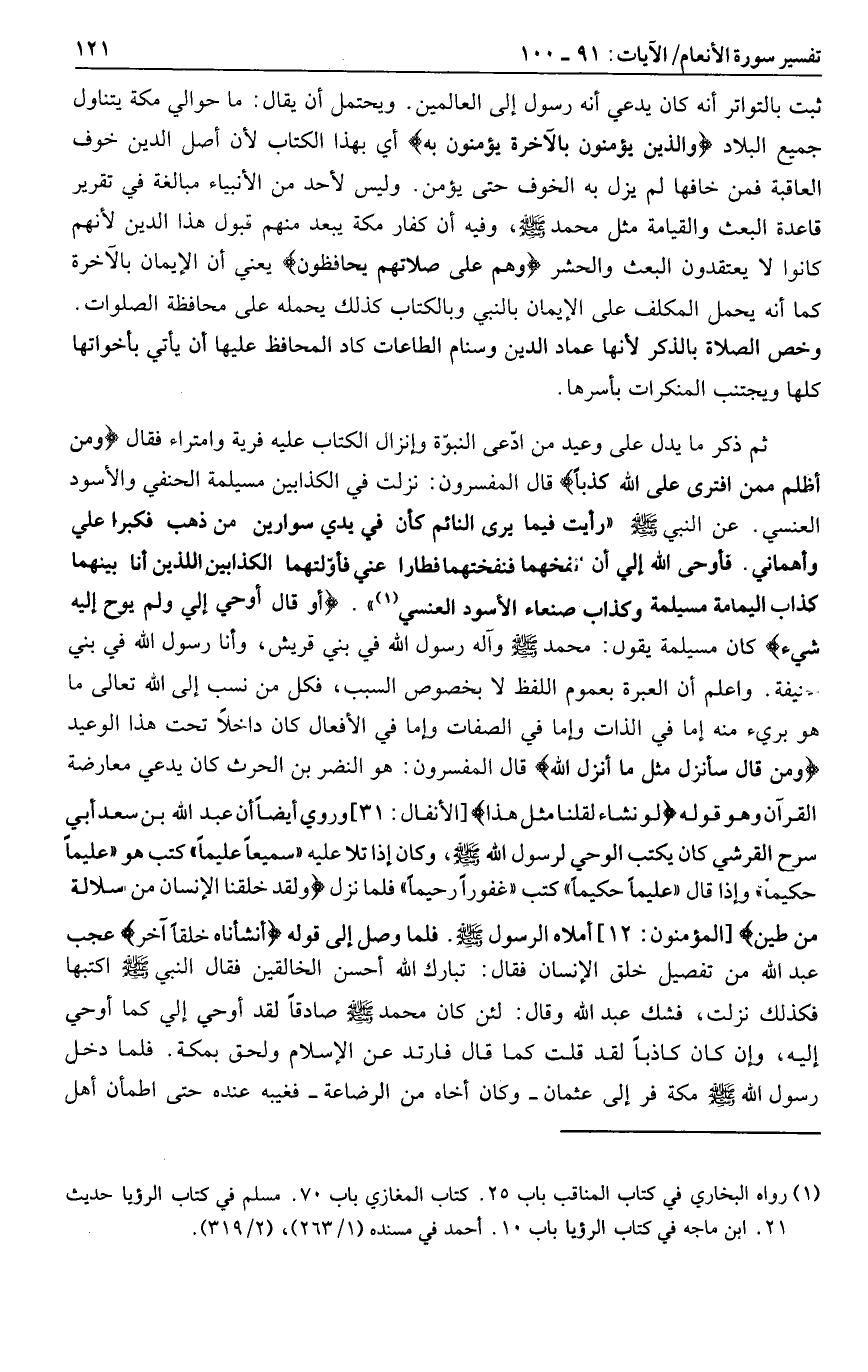 ثبت بالتواتر أنه كان يدعي أنه رسول إلى العالمين. ويحتمل أن يقال: ما حوالي مكة يتناول جميع البلاد وَالَّذِينَ يُؤْمِنُونَ بِالْآخِرَةِ يُؤْمِنُونَ بِهِ أي بهذا الكتاب لأن أصل الدين خوف العاقبة فمن خافها لم يزل به الخوف حتى يؤمن. وليس لأحد من الأنبياء مبالغة في تقرير قاعدة البعث والقيامة مثل محمد صلى الله عليه وسلم، وفيه أن كفار مكة يبعد منهم قبول هذا الدين لأنهم كانوا لا يعتقدون البعث والحشر وَهُمْ عَلى صَلاتِهِمْ يُحافِظُونَ يعني أن الإيمان بالآخرة كما أنه يحمل المكلف على الإيمان بالنبي وبالكتاب كذلك يحمله على محافظة الصلوات.