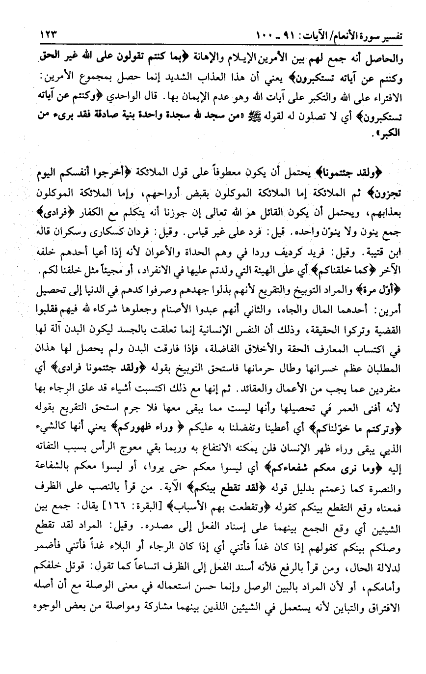 أَوَّلَ مَرَّةٍ والمراد التوبيخ والتقريع لأنهم بذلوا جهدهم وصرفوا كدهم في الدنيا إلى تحصيل أمرين: أحدهما المال والجاه، والثاني أنهم عبدوا الأصنام وجعلوها شركاء لله فيهم فقلبوا القضية وتركوا الحقيقة، وذلك أن النفس الإنسانية إنما تعلقت بالجسد ليكون البدن آلة لها في اكتساب المعارف الحقة والأخلاق الفاضلة، فإذا فارقت البدن ولم يحصل لها هذان المطلبان عظم خسرانها وطال حرمانها فاستحق التوبيخ بقوله وَلَقَدْ جِئْتُمُونا فُرادى أي منفردين عما يجب من الأعمال والعقائد. ثم إنها مع ذلك اكتسبت أشياء قد علق الرجاء بها لأنه أفنى العمر في تحصيلها وأنها ليست مما يبقى معها فلا جرم استحق التقريع بقوله وَتَرَكْتُمْ ما خَوَّلْناكُمْ أي أعطينا وتفضلنا به عليكم وَراءَ ظُهُورِكُمْ يعني أنها كالشيء الذي يبقى وراء ظهر الإنسان فلن يمكنه الانتفاع به وربما بقي معوج الرأس بسبب التفاته إليه وَما نَرى مَعَكُمْ شُفَعاءَكُمُ أي ليسوا معكم حتى يروا، أو ليسوا معكم بالشفاعة والنصرة كما زعمتم بدليل قوله لَقَدْ تَقَطَّعَ بَيْنَكُمْ الآية. من قرأ بالنصب على الظرف فمعناه وقع التقطع بينكم كقوله وَتَقَطَّعَتْ بِهِمُ الْأَسْبابُ [البقرة: 166] يقال: جمع بين الشيئين أي وقع الجمع بينهما على إسناد الفعل إلى مصدره. وقيل: المراد لقد تقطع وصلكم بينكم كقولهم إذا كان غدا فأتني أي إذا كان الرجاء أو البلاء غدا فأتني فأضمر لدلالة الحال، ومن قرأ بالرفع فلأنه أسند الفعل إلى الظرف اتساعا كما تقول: قوتل خلفكم وأمامكم، أو لأن المراد بالبين الوصل وإنما حسن استعماله في معنى الوصلة مع أن أصله الافتراق والتباين لأنه يستعمل في الشيئين اللذين بينهما مشاركة ومواصلة من بعض الوجوه