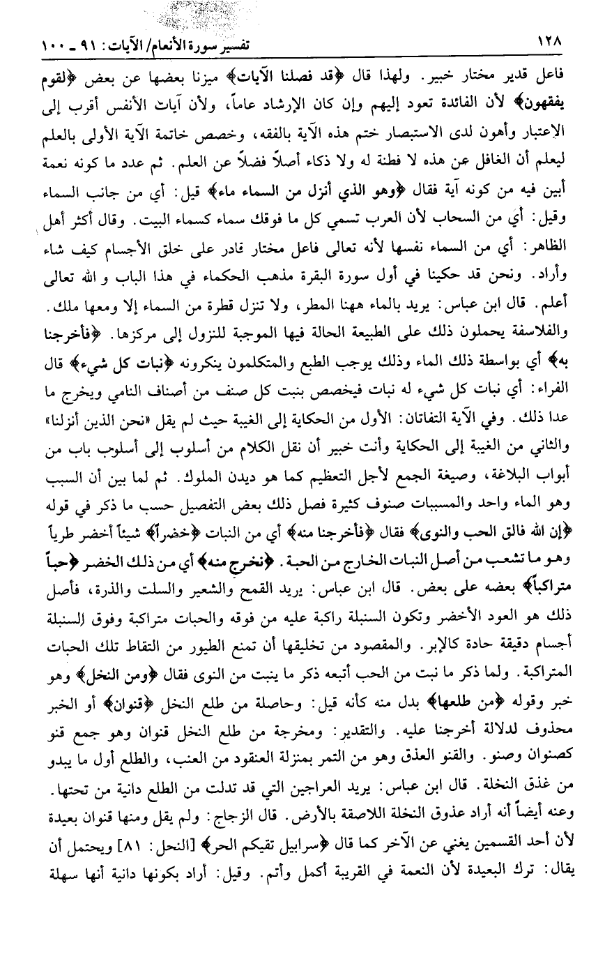 والفلاسفة يحملون ذلك على الطبيعة الحالة فيها الموجبة للنزول إلى مركزها. فَأَخْرَجْنا بِهِ أي بواسطة ذلك الماء وذلك يوجب الطبع والمتكلمون ينكرونه نَباتَ كُلِّ شَيْءٍ قال الفراء: أي نبات كل شيء له نبات فيخصص بنبت كل صنف من أصناف النامي ويخرج ما عدا ذلك. وفي الآية التفاتان: الأول من الحكاية إلى الغيبة حيث لم يقل «نحن الذين أنزلنا» والثاني من الغيبة إلى الحكاية وأنت خبير أن نقل الكلام من أسلوب إلى أسلوب باب من أبواب البلاغة، وصيغة الجمع لأجل التعظيم كما هو ديدن الملوك. ثم لما بين أن السبب وهو الماء واحد والمسببات صنوف كثيرة فصل ذلك بعض التفصيل حسب ما ذكر في قوله إِنَّ اللَّهَ فالِقُ الْحَبِّ وَالنَّوى فقال فَأَخْرَجْنا مِنْهُ أي من النبات خَضِراً شيئا أخضر طريا وهو ما تشعب من أصل النبات الخارج من الحبة. نُخْرِجُ مِنْهُ أي من ذلك الخضر حَبًّا مُتَراكِباً بعضه على بعض. قال ابن عباس: يريد القمح والشعير والسلت والذرة، فأصل ذلك هو العود الأخضر وتكون السنبلة راكبة عليه من فوقه والحبات متراكبة وفوق السنبلة أجسام دقيقة حادة كالإبر. والمقصود من تخليقها أن تمنع الطيور من التقاط تلك الحبات المتراكبة. ولما ذكر ما نبت من الحب أتبعه ذكر ما ينبت من النوى فقال وَمِنَ النَّخْلِ وهو خبر وقوله مِنْ طَلْعِها بدل منه كأنه قيل: وحاصلة من طلع النخل قِنْوانٌ أو الخبر محذوف لدلالة أخرجنا عليه. والتقدير: ومخرجة من طلع النخل قنوان وهو جمع قنو كصنوان وصنو. والقنو العذق وهو من التمر بمنزلة العنقود من العنب، والطلع أول ما يبدو من غذق النخلة. قال ابن عباس: يريد العراجين التي قد تدلت من الطلع دانية من تحتها.