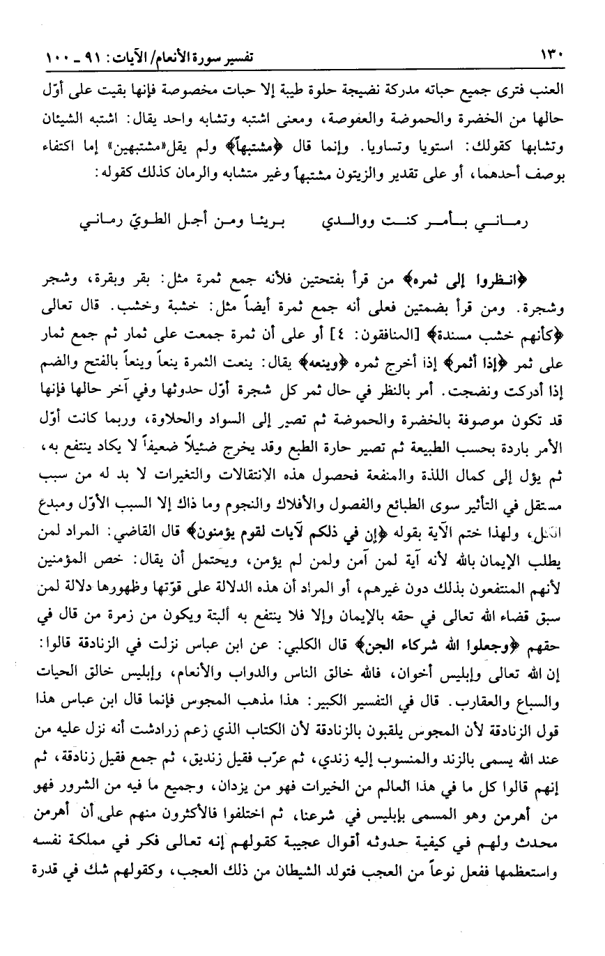 انْظُرُوا إِلى ثَمَرِهِ من قرأ بفتحتين فلأنه جمع ثمرة مثل: بقر وبقرة، وشجر وشجرة. ومن قرأ بضمتين فعلى أنه جمع ثمرة أيضا مثل: خشبة وخشب. قال تعالى كَأَنَّهُمْ خُشُبٌ مُسَنَّدَةٌ [المنافقون: 4] أو على أن ثمرة جمعت على ثمار ثم جمع ثمار على ثمر إِذا أَثْمَرَ إذا أخرج ثمره وَيَنْعِهِ يقال: ينعت الثمرة ينعا وينعا بالفتح والضم إذا أدركت ونضجت. أمر بالنظر في حال ثمر كل شجرة أوّل حدوثها وفي آخر حالها فإنها قد تكون موصوفة بالخضرة والحموضة ثم تصير إلى السواد والحلاوة، وربما كانت أوّل الأمر باردة بحسب الطبيعة ثم تصير حارة الطبع وقد يخرج ضئيلا ضعيفا لا يكاد ينتفع به، ثم يؤل إلى كمال اللذة والمنفعة فحصول هذه الانتقالات والتغيرات لا بد له من سبب مستقل في التأثير سوى الطبائع والفصول والأفلاك والنجوم وما ذاك إلا السبب الأوّل ومبدع الكل، ولهذا ختم الآية بقوله إِنَّ فِي ذلِكُمْ لَآياتٍ لِقَوْمٍ يُؤْمِنُونَ قال القاضي: المراد لمن يطلب الإيمان بالله لأنه آية لمن آمن ولمن لم يؤمن، ويحتمل أن يقال: خص المؤمنين لأنهم المنتفعون بذلك دون غيرهم، أو المراد أن هذه الدلالة على قوّتها وظهورها دلالة لمن سبق قضاء الله تعالى في حقه بالإيمان وإلا فلا ينتفع به البتة ويكون من زمرة من قال في حقهم وَجَعَلُوا لِلَّهِ شُرَكاءَ الْجِنَّ قال الكلبي: عن ابن عباس نزلت في الزنادقة قالوا: