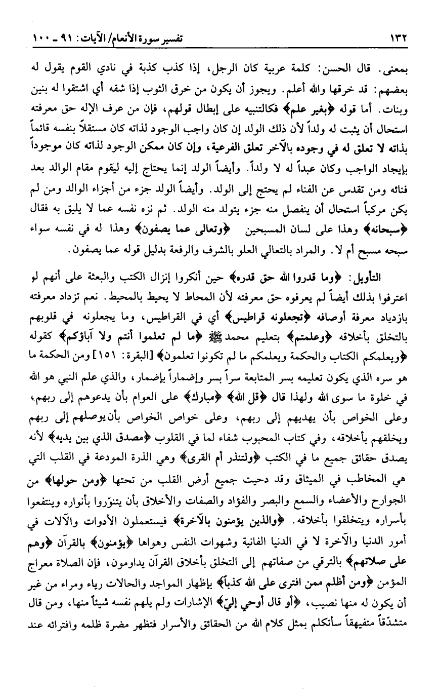 وَما قَدَرُوا اللَّهَ حَقَّ قَدْرِهِ حين أنكروا إنزال الكتب والبعثة على أنهم لو اعترفوا بذلك أيضا لم يعرفوه حق معرفته لأن المحاط لا يحيط بالمحيط. نعم تزداد معرفته بازدياد معرفة أوصافه تَجْعَلُونَهُ قَراطِيسَ أي في القراطيس، وما يجعلونه في قلوبهم بالتخلق بأخلاقه وَعُلِّمْتُمْ بتعليم محمد صلى الله عليه وسلم ما لَمْ تَعْلَمُوا أَنْتُمْ وَلا آباؤُكُمْ كقوله وَيُعَلِّمُكُمُ الْكِتابَ وَالْحِكْمَةَ وَيُعَلِّمُكُمْ ما لَمْ تَكُونُوا تَعْلَمُونَ [البقرة: 151] ومن الحكمة ما هو سره الذي يكون تعليمه بسر المتابعة سرا بسر وإضمارا بإضمار، والذي علم النبي هو الله في خلوة ما سوى الله ولهذا قال قُلِ اللَّهُ مُبارَكٌ على العوام بأن يدعوهم إلى ربهم، وعلى الخواص بأن يهديهم إلى ربهم، وعلى خواص الخواص بأن يوصلهم إلى ربهم ويخلقهم بأخلاقه، وفي كتاب المحبوب شفاء لما في القلوب مُصَدِّقُ الَّذِي بَيْنَ يَدَيْهِ لأنه يصدق حقائق جميع ما في الكتب وَلِتُنْذِرَ أُمَّ الْقُرى وهي الذرة المودعة في القلب التي هي المخاطب في الميثاق وقد دحيت جميع أرض القلب من تحتها وَمَنْ حَوْلَها من الجوارح والأعضاء والسمع والبصر والفؤاد والصفات والأخلاق بأن يتنوّروا بأنواره وينتفعوا بأسراره ويتخلقوا بأخلاقه. وَالَّذِينَ يُؤْمِنُونَ بِالْآخِرَةِ فيستعملون الأدوات والآلات في أمور الدنيا والآخرة لا في الدنيا الفانية وشهوات النفس وهواها يُؤْمِنُونَ بالقرآن وَهُمْ عَلى صَلاتِهِمْ بالترقي من صفاتهم إلى التخلق بأخلاق القرآن يداومون، فإن الصلاة معراج المؤمن وَمَنْ أَظْلَمُ مِمَّنِ افْتَرى عَلَى اللَّهِ كَذِباً بإظهار المواجد والحالات رياء ومراء من غير أن يكون له منها نصيب، أَوْ قالَ أُوحِيَ إِلَيَّ الإشارات ولم يلهم نفسه شيئا منها، ومن قال متشدّقا متفيهقا سأتكلم بمثل كلام الله من الحقائق والأسرار فتظهر مضرة ظلمه وافترائه عند