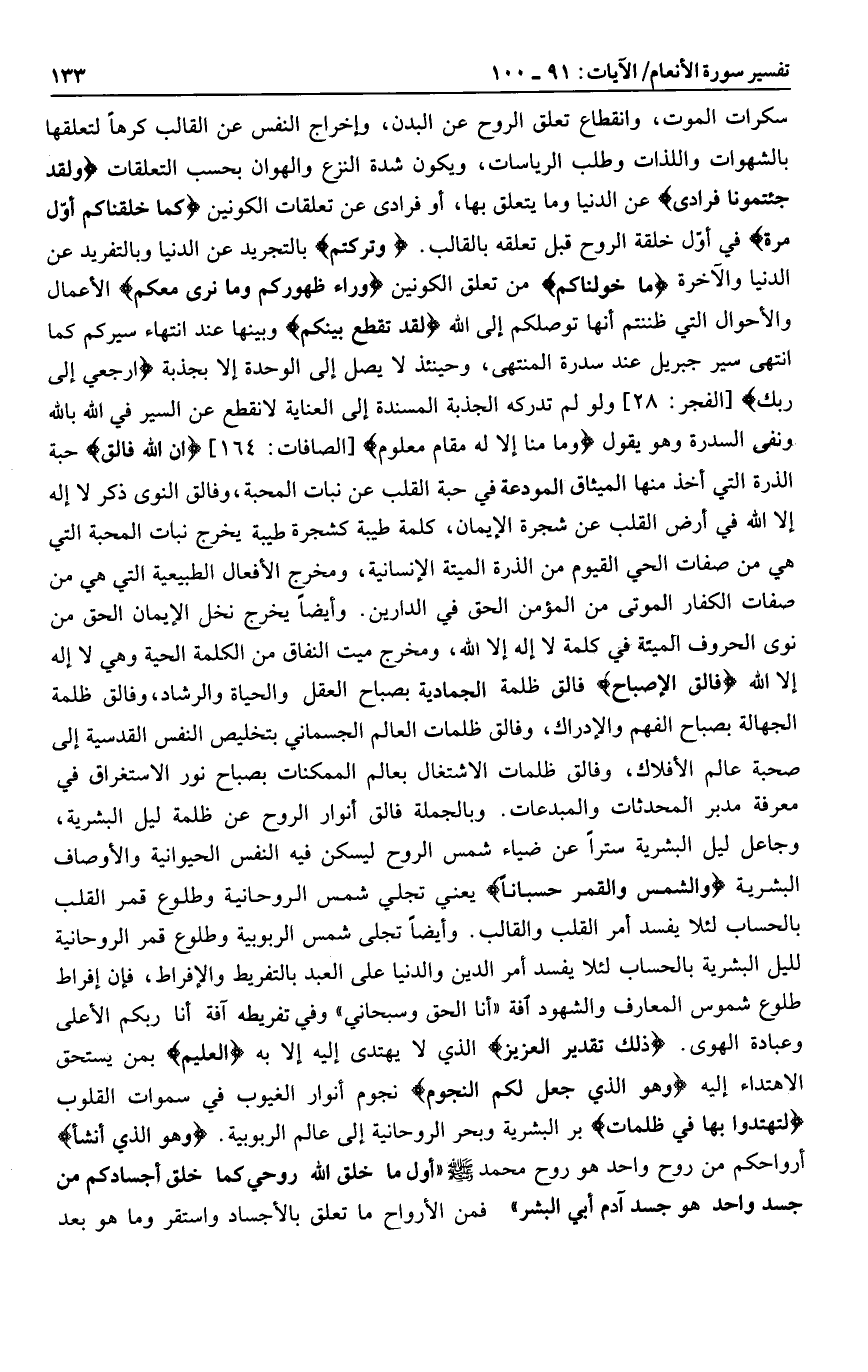 سكرات الموت، وانقطاع تعلق الروح عن البدن، وإخراج النفس عن القالب كرها لتعلقها بالشهوات واللذات وطلب الرياسات، ويكون شدة النزع والهوان بحسب التعلقات وَلَقَدْ جِئْتُمُونا فُرادى عن الدنيا وما يتعلق بها، أو فرادى عن تعلقات الكونين كَما خَلَقْناكُمْ أَوَّلَ مَرَّةٍ في أوّل خلقة الروح قبل تعلقه بالقالب. وَتَرَكْتُمْ بالتجريد عن الدنيا وبالتفريد عن الدنيا والآخرة ما خَوَّلْناكُمْ من تعلق الكونين وَراءَ ظُهُورِكُمْ وَما نَرى مَعَكُمْ الأعمال والأحوال التي ظننتم أنها توصلكم إلى الله لَقَدْ تَقَطَّعَ بَيْنَكُمْ وبينها عند انتهاء سيركم كما انتهى سير جبريل عند سدرة المنتهى، وحينئذ لا يصل إلى الوحدة إلا بجذبة ارْجِعِي إِلى رَبِّكِ [الفجر: 28] ولو لم تدركه الجذبة المسندة إلى العناية لانقطع عن السير في الله بالله ونفى السدرة وهو يقول وَما مِنَّا إِلَّا لَهُ مَقامٌ مَعْلُومٌ [الصافات: 164] إِنَّ اللَّهَ فالِقُ حبة الذرة التي أخذ منها الميثاق المودعة في حبة القلب عن نبات المحبة، وفالق النوى ذكر لا إله إلا الله في أرض القلب عن شجرة الإيمان، كلمة طيبة كشجرة طيبة يخرج نبات المحبة التي هي من صفات الحي القيوم من الذرة الميتة الإنسانية، ومخرج الأفعال الطبيعية التي هي من صفات الكفار الموتى من المؤمن الحق في الدارين. وأيضا يخرج نخل الإيمان الحق من نوى الحروف الميتة في كلمة لا إله إلا الله، ومخرج ميت النفاق من الكلمة الحية وهي لا إله إلا الله فالِقُ الْإِصْباحِ فالق ظلمة الجمادية بصباح العقل والحياة والرشاد، وفالق ظلمة الجهالة بصباح الفهم والإدراك، وفالق ظلمات العالم الجسماني بتخليص النفس القدسية إلى صحبة عالم الأفلاك، وفالق ظلمات الاشتغال بعالم الممكنات بصباح نور الاستغراق في معرفة مدبر المحدثات والمبدعات. وبالجملة فالق أنوار الروح عن ظلمة ليل البشرية، وجاعل ليل البشرية سترا عن ضياء شمس الروح ليسكن فيه النفس الحيوانية والأوصاف البشرية وَالشَّمْسَ وَالْقَمَرَ حُسْباناً يعني تجلي شمس الروحانية وطلوع قمر القلب بالحساب لئلا يفسد أمر القلب والقالب. وأيضا تجلى شمس الربوبية وطلوع قمر الروحانية لليل البشرية بالحساب لئلا يفسد أمر الدين والدنيا على العبد بالتفريط والإفراط، فإن إفراط طلوع شموس المعارف والشهود آفة «أنا الحق وسبحاني» وفي تفريطه آفة أنا ربكم الأعلى وعبادة الهوى. ذلِكَ تَقْدِيرُ الْعَزِيزِ الذي لا يهتدى إليه إلا به الْعَلِيمِ بمن يستحق الاهتداء إليه وَهُوَ الَّذِي جَعَلَ لَكُمُ النُّجُومَ نجوم أنوار الغيوب في سموات القلوب لِتَهْتَدُوا بِها فِي ظُلُماتِ بر البشرية وبحر الروحانية إلى عالم الربوبية. وَهُوَ الَّذِي أَنْشَأَكُمْ أرواحكم