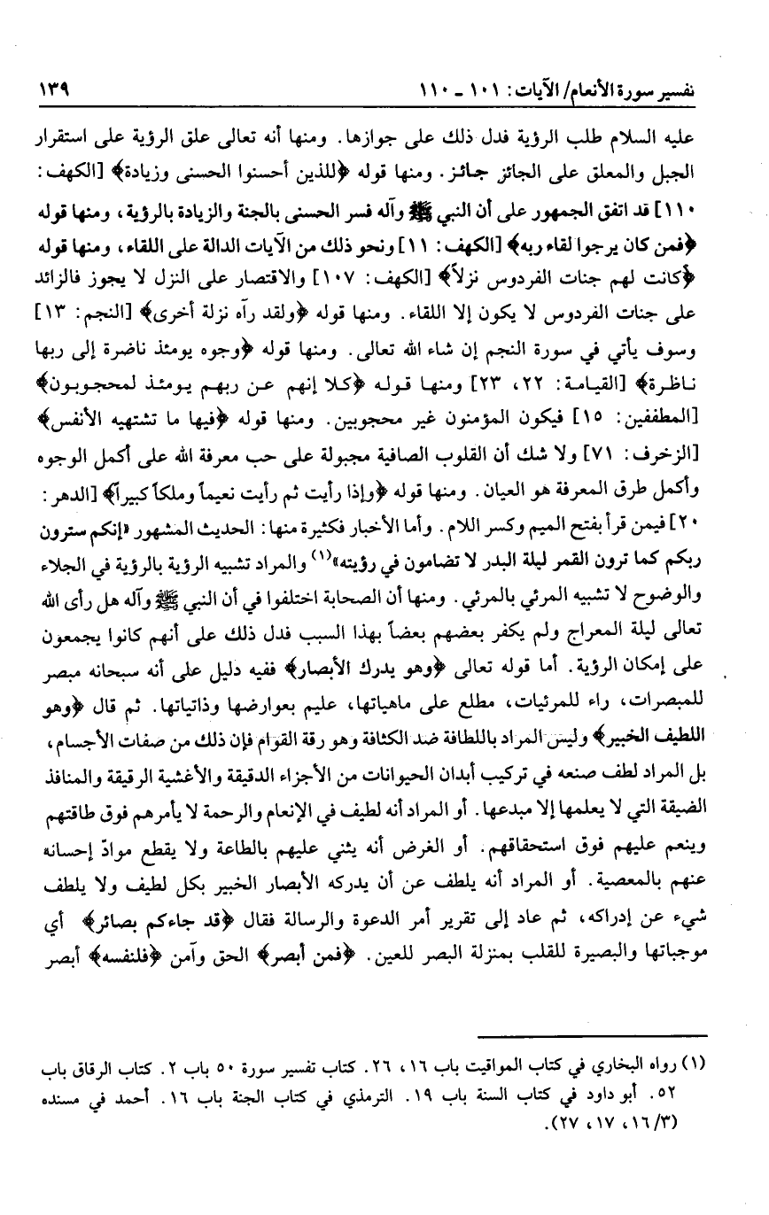 110] قد اتفق الجمهور على أن النبي صلى الله عليه وسلم وآله فسر الحسنى بالجنة والزيادة بالرؤية، ومنها قوله فَمَنْ كانَ يَرْجُوا لِقاءَ رَبِّهِ [الكهف: 11] ونحو ذلك من الآيات الدالة على اللقاء، ومنها قوله كانَتْ لَهُمْ جَنَّاتُ الْفِرْدَوْسِ نُزُلًا [الكهف: 107] والاقتصار على النزل لا يجوز فالزائد على جنات الفردوس لا يكون إلا اللقاء. ومنها قوله وَلَقَدْ رَآهُ نَزْلَةً أُخْرى [النجم: 13] وسوف يأتي في سورة النجم إن شاء الله تعالى. ومنها قوله وُجُوهٌ يَوْمَئِذٍ ناضِرَةٌ إِلى رَبِّها ناظِرَةٌ [القيامة: 22، 23] ومنها قوله كَلَّا إِنَّهُمْ عَنْ رَبِّهِمْ يَوْمَئِذٍ لَمَحْجُوبُونَ [المطففين: 15] فيكون المؤمنون غير محجوبين. ومنها قوله فِيها ما تَشْتَهِيهِ الْأَنْفُسُ [الزخرف: 71] ولا شك أن القلوب الصافية مجبولة على حب معرفة الله على أكمل الوجوه وأكمل طرق المعرفة هو العيان. ومنها قوله وَإِذا رَأَيْتَ ثَمَّ رَأَيْتَ نَعِيماً وَمُلْكاً كَبِيراً [الدهر: