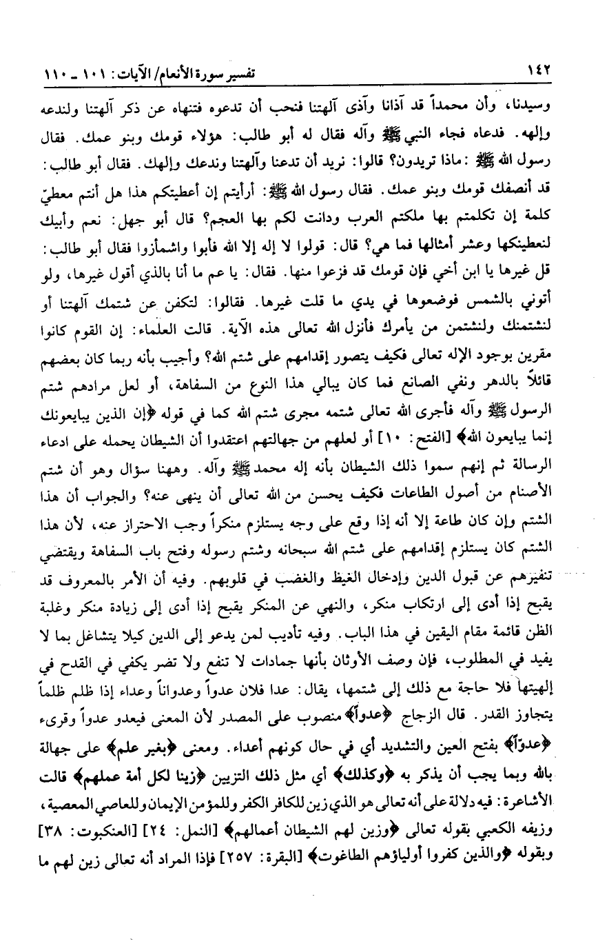وسيدنا، وأن محمدا قد آذانا وآذى آلهتنا فنحب أن تدعوه فتنهاه عن ذكر آلهتنا ولندعه وإلهه. فدعاه فجاء النبي صلى الله عليه وسلم وآله فقال له أبو طالب: هؤلاء قومك وبنو عمك. فقال رسول الله صلى الله عليه وسلم: ماذا تريدون؟ قالوا: نريد أن تدعنا وآلهتنا وندعك وإلهك. فقال أبو طالب:
