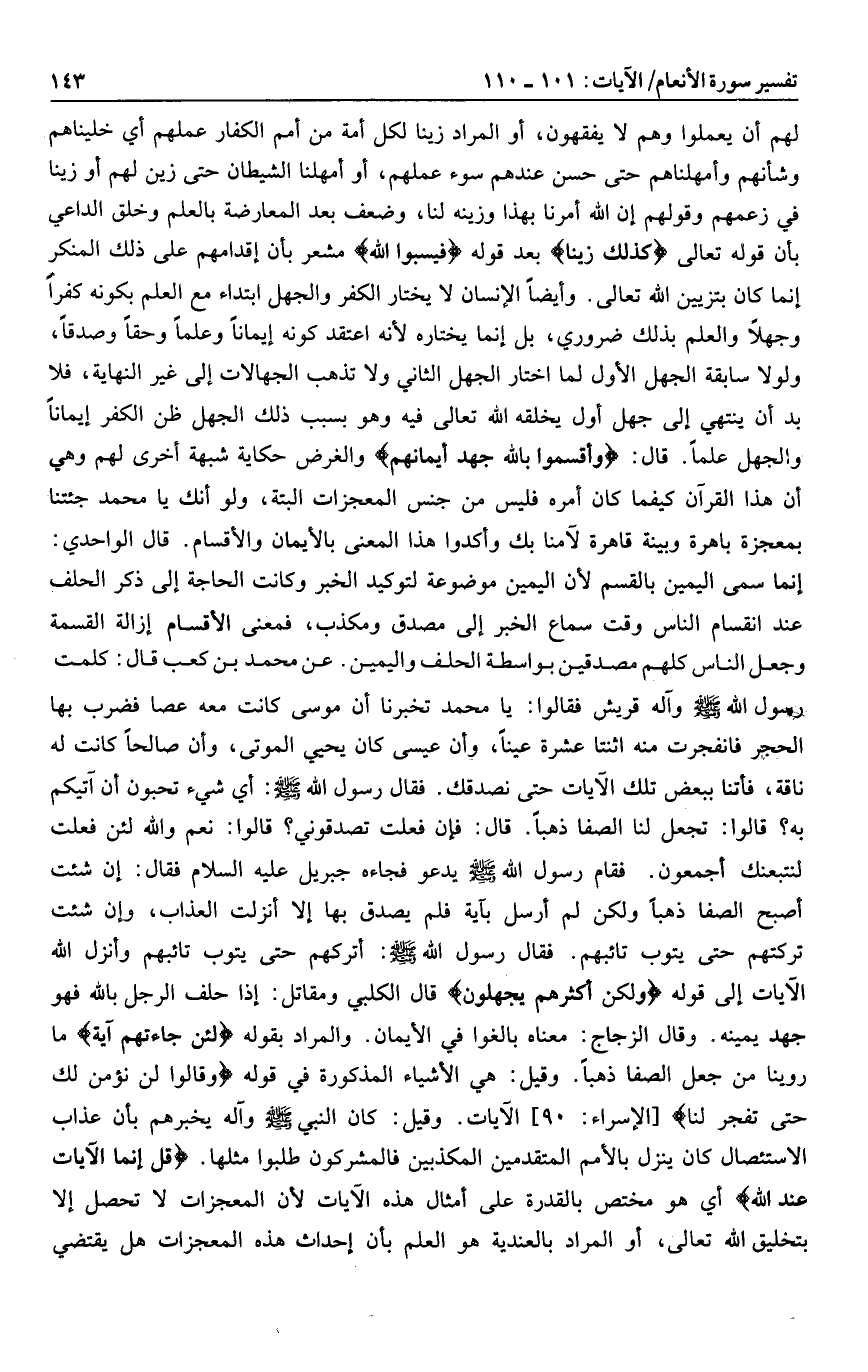 عن محمد بن كعب قال: كلمت رسول الله صلى الله عليه وسلم وآله قريش فقالوا: يا محمد تخبرنا أن موسى كانت معه عصا فضرب بها الحجر فانفجرت منه اثنتا عشرة عينا، وأن عيسى كان يحيي الموتى، وأن صالحا كانت له ناقة، فأتنا ببعض تلك الآيات حتى نصدقك. فقال رسول الله صلى الله عليه وسلم: أي شيء تحبون أن آتيكم به؟ قالوا: تجعل لنا الصفا ذهبا. قال: فإن فعلت تصدقوني؟ قالوا: نعم والله لئن فعلت لنتبعنك أجمعون. فقام رسول الله صلى الله عليه وسلم يدعو فجاءه جبريل عليه السلام فقال: إن شئت أصبح الصفا ذهبا ولكن لم أرسل بآية فلم يصدق بها إلا أنزلت العذاب، وإن شئت تركتهم حتى يتوب تائبهم. فقال رسول الله صلى الله عليه وسلم: أتركهم حتى يتوب تائبهم وأنزل الله الآيات إلى قوله وَلكِنَّ أَكْثَرَهُمْ يَجْهَلُونَ