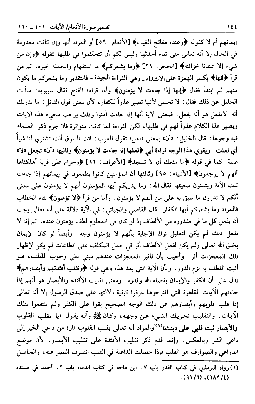 إيمانهم أم لا كقوله وَعِنْدَهُ مَفاتِحُ الْغَيْبِ [الأنعام: 59] أو المراد أنها وإن كانت معدومة في الحال إلا أنه تعالى متى شاء أحدثها وليس لكم أن تتحكموا في طلبها كقوله وَإِنْ مِنْ شَيْءٍ إِلَّا عِنْدَنا خَزائِنُهُ [الحجر: 21] وَما يُشْعِرُكُمْ ما استفهام والجملة خبره، ثم من قرأ أَنَّها بكسر الهمزة على الابتداء- وهي القراءة الجيدة- فالتقدير وما يشعركم ما يكون منهم ثم ابتدأ فقال أَنَّها إِذا جاءَتْ لا يُؤْمِنُونَ وأما قراءة الفتح فقال سيبويه: سألت الخليل عن ذلك فقال: لا تحسن لأنها تصير عذرا للكفار، لأن معنى قول القائل: ما يدريك أنه لا يفعل هو أنه يفعل. فمعنى الآية أنها إذا جاءت آمنوا وذلك يوجب مجيء هذه الآيات ويصير هذا الكلام عذرا لهم في طلبها، لكن القراءة لما كانت متواترة فلا جرم ذكر العلماء فيه وجوها: قال الخليل: «أن» بمعنى «لعل» تقول العرب: ائت السوق أنك تشتري لنا شيأ أي لعلك. ويقوي هذا الوجه قراءة أبي لعلها إذا جاءت لا يؤمنون وثانيها «أن» تجعل «لا» صلة كما في قوله ما مَنَعَكَ أَلَّا تَسْجُدَ [الأعراف: 12] وَحَرامٌ عَلى قَرْيَةٍ أَهْلَكْناها أَنَّهُمْ لا يَرْجِعُونَ [الأنبياء: 95] وثالثها أن المؤمنين كانوا يطمعون في إيمانهم إذا جاءت تلك الآية ويتمنون مجيئها فقال الله: وما يدريكم أيها المؤمنون أنهم لا يؤمنون على معنى أنكم لا تدرون ما سبق به على من أنهم لا يؤمنون. وأما من قرأ لا تُؤْمِنُونَ بتاء الخطاب فالمراد وما يشعركم أيها الكفار. قال القاضي والجبائي: في الآية دلالة على أنه تعالى يجب أن يفعل كل ما في مقدوره من الألطاف إذ لو كان في المعلوم لطف يؤمنون عنده، ثم إنه لا يفعل ذلك لم يكن لتعليل ترك الإجابة بأنهم لا يؤمنون وجه. وأيضا لو كان الإيمان بخلق الله تعالى ولم يكن لفعل الألطاف أثر في حمل المكلف على الطاعات لم يكن لإظهار تلك المعجزات أثر. وأجيب بأن تأثير المعجزات عندهم مبني على وجوب اللطف، فلو أثبت اللطف به لزم الدور، وبأن الآية التي بعد هذه وهي قوله وَنُقَلِّبُ أَفْئِدَتَهُمْ وَأَبْصارَهُمْ تدل على أن الكفر والإيمان بقضاء الله وقدره. ومعنى تقليب الأفئدة والأبصار هو أنهم إذا جاءتهم الآيات القاهرة التي اقترحوها عرفوا كيفية دلالتها على صدق الرسول إلا أنه تعالى إذا قلب قلوبهم وأبصارهم عن ذلك الوجه الصحيح بقوا على الكفر ولم ينتفعوا بتلك الآيات. والتقليب تحريك الشيء عن وجهه،