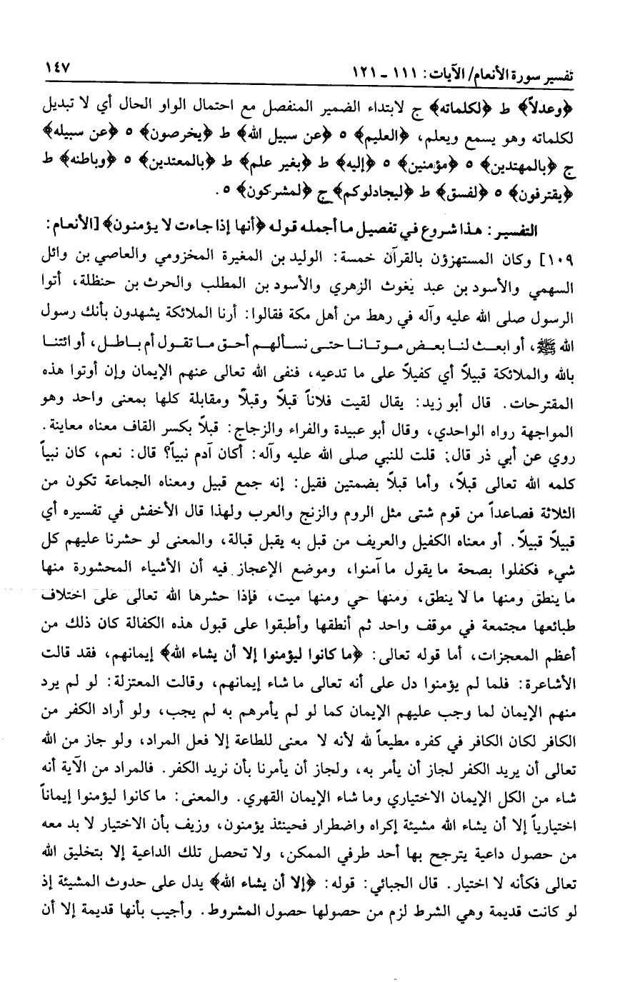 وأما قبلا بضمتين فقيل: إنه جمع قبيل ومعناه الجماعة تكون من الثلاثة فصاعدا من قوم شتى مثل الروم والزنج والعرب ولهذا قال الأخفش في تفسيره أي قبيلا قبيلا. أو معناه الكفيل والعريف من قبل به يقبل قبالة، والمعنى لو حشرنا عليهم كل شيء فكفلوا بصحة ما يقول ما آمنوا، وموضع الإعجاز فيه أن الأشياء المحشورة منها ما ينطق ومنها ما لا ينطق، ومنها حي ومنها ميت، فإذا حشرها الله تعالى على اختلاف طبائعها مجتمعة في موقف واحد ثم أنطقها وأطبقوا على قبول هذه الكفالة كان ذلك من أعظم المعجزات، أما قوله تعالى: ما كانُوا لِيُؤْمِنُوا إِلَّا أَنْ يَشاءَ اللَّهُ إيمانهم، فقد قالت الأشاعرة: فلما لم يؤمنوا دل على أنه تعالى ما شاء إيمانهم، وقالت المعتزلة: لو لم يرد منهم الإيمان لما وجب عليهم الإيمان كما لو لم يأمرهم به لم يجب، ولو أراد الكفر من الكافر لكان الكافر في كفره مطيعا لله لأنه لا معنى للطاعة إلا فعل المراد، ولو جاز من الله تعالى أن يريد الكفر لجاز أن يأمر به، ولجاز أن يأمرنا بأن نريد الكفر. فالمراد من الآية أنه شاء من الكل الإيمان الاختياري وما شاء الإيمان القهري. والمعنى: ما كانوا ليؤمنوا إيمانا اختياريا إلا أن يشاء الله مشيئة إكراه واضطرار فحينئذ يؤمنون، وزيف بأن الاختيار لا بد معه من حصول داعية يترجح بها أحد طرفي الممكن، ولا تحصل تلك الداعية إلا بتخليق الله تعالى فكأنه لا اختيار. قال الجبائي: قوله: إِلَّا أَنْ يَشاءَ اللَّهُ يدل على حدوث المشيئة إذ لو كانت قديمة وهي الشرط لزم من حصولها حصول المشروط. وأجيب بأنها قديمة إلا أن