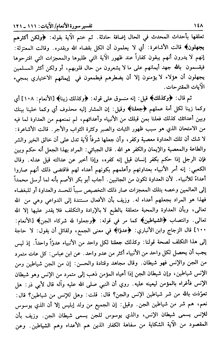لا شك أن تلك العداوة معصية وكفر، وأن جعلها شرفا لآية تدل على أن خالق الخير والشر والطاعة والمعصية والإيمان والكفر هو الله. قال الجبائي: المراد بهذا الجعل أنه حكم وبين فإن الرجل إذا حكم بكفر إنسان قيل إنه كفره، وإذا أخبر عن عدالته قيل عدله. وقال الكعبي: إنه أمر الأنبياء بعداوتهم وأعلمهم بكونهم أعداء لهم فاقتضى ذلك أنهم صاروا أعداء للأنبياء. لأن العداوة تكون من الجانبين. أجاب أبو بكر الأصم بأنه لما أرسل محمدا إلى العالمين وخصه بتلك المعجزات صار ذلك التخصيص سببا للحسد والعداوة أو للبغضاء فهذا هو المراد بجعلهم أعداء له. وزيف بأن الأفعال مستندة إلى الدواعي وهي من الله تعالى، وبأن العداوة والمحبة متعلقة بالطبع لا بالإرادة والتكلف فلا يقدر عليها إلا الله تعالى. وانتصاب ال شَياطِينَ كما مر في قوله: وَجَعَلُوا لِلَّهِ شُرَكاءَ الْجِنَّ [الأنعام: