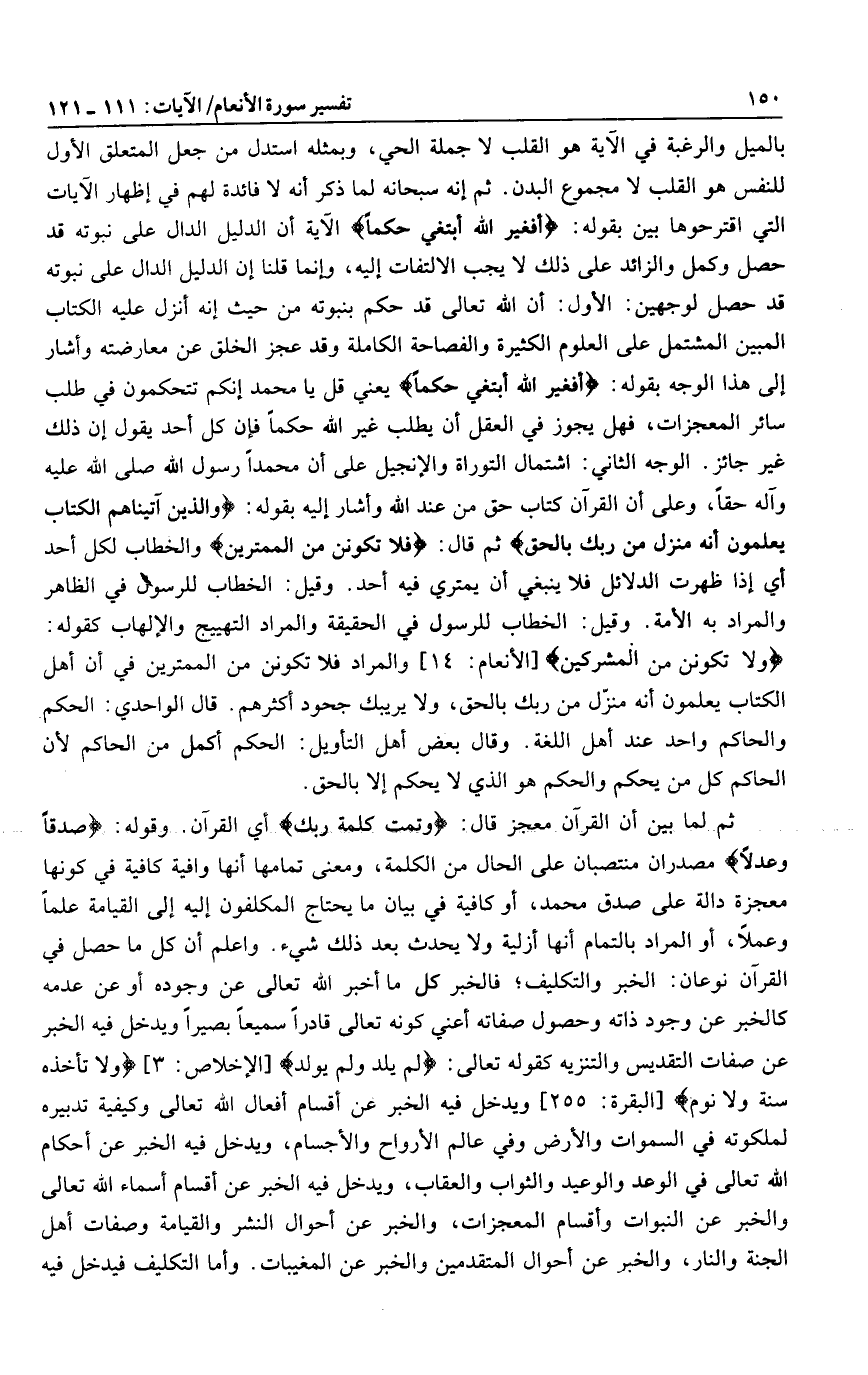 بالميل والرغبة في الآية هو القلب لا جملة الحي، وبمثله استدل من جعل المتعلق الأول للنفس هو القلب لا مجموع البدن. ثم إنه سبحانه لما ذكر أنه لا فائدة لهم في إظهار الآيات التي اقترحوها بين بقوله: أَفَغَيْرَ اللَّهِ أَبْتَغِي حَكَماً الآية أن الدليل الدال على نبوته قد حصل وكمل والزائد على ذلك لا يجب الالتفات إليه، وإنما قلنا إن الدليل الدال على نبوته قد حصل لوجهين: الأول: أن الله تعالى قد حكم بنبوته من حيث إنه أنزل عليه الكتاب المبين المشتمل على العلوم الكثيرة والفصاحة الكاملة وقد عجز الخلق عن معارضته وأشار إلى هذا الوجه بقوله: أَفَغَيْرَ اللَّهِ أَبْتَغِي حَكَماً يعني قل يا محمد إنكم تتحكمون في طلب سائر المعجزات، فهل يجوز في العقل أن يطلب غير الله حكما فإن كل أحد يقول إن ذلك غير جائز. الوجه الثاني: اشتمال التوراة والإنجيل على أن محمدا رسول الله صلى الله عليه وآله حقا، وعلى أن القرآن كتاب حق من عند الله وأشار إليه بقوله: وَالَّذِينَ آتَيْناهُمُ الْكِتابَ يَعْلَمُونَ أَنَّهُ مُنَزَّلٌ مِنْ رَبِّكَ بِالْحَقِّ ثم قال: فَلا تَكُونَنَّ مِنَ الْمُمْتَرِينَ والخطاب لكل أحد أي إذا ظهرت الدلائل فلا ينبغي